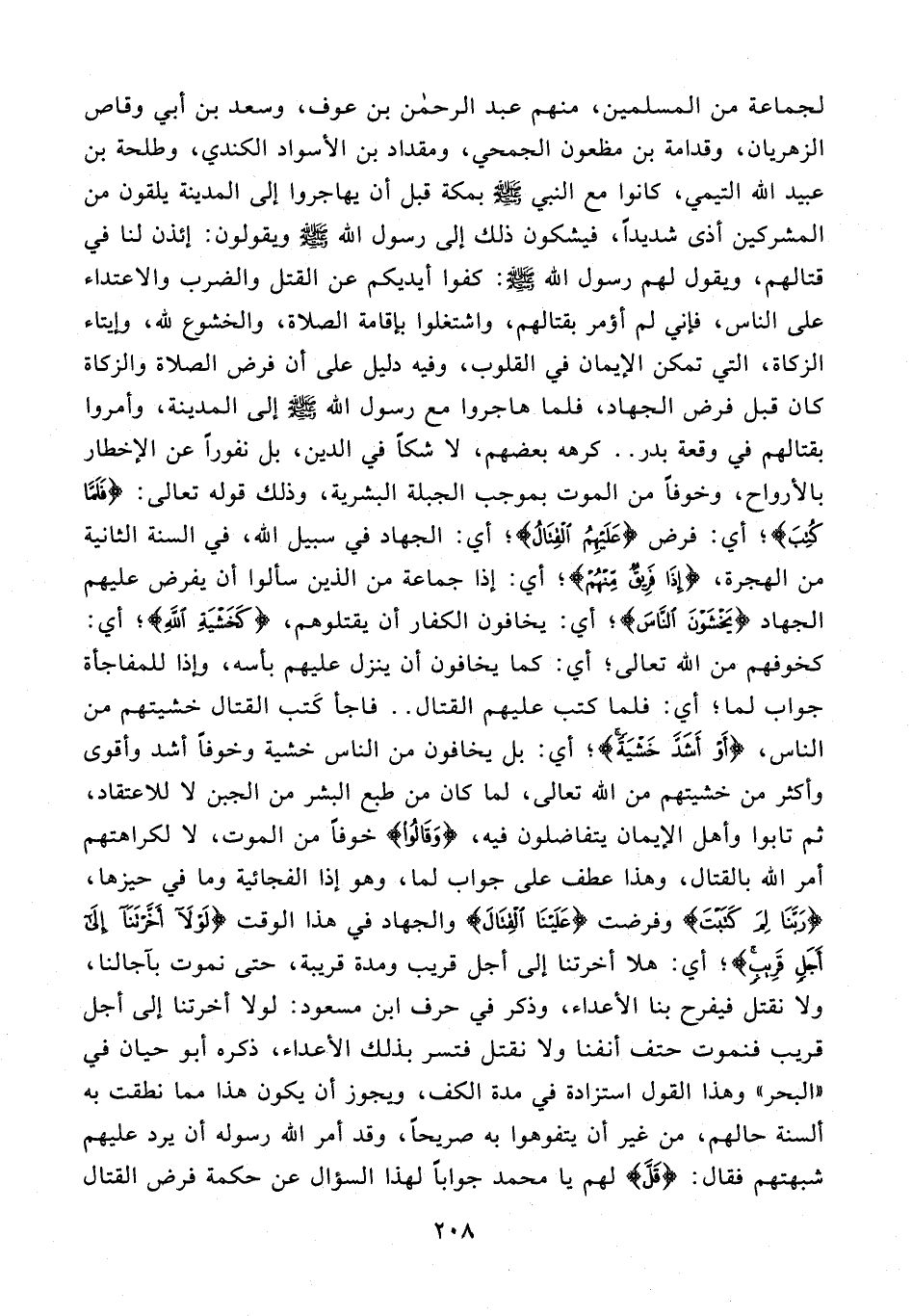لجماعة من المسلمين، منهم عبد الرحمن بن عوف، وسعد بن أبي وقاص الزهريان، وقدامة بن مظعون الجمحي، ومقداد بن الأسواد الكندي، وطلحة بن عبيد الله التيمي، كانوا مع النبي - صلى الله عليه وسلم - بمكة قبل أن يهاجروا إلى المدينة يلقون من المشركين أذى شديدًا، فيشكون ذلك إلى رسول الله - صلى الله عليه وسلم - ويقولون: إئذن لنا في قتالهم، ويقول لهم رسول الله - صلى الله عليه وسلم -: كفوا أيديكم عن القتل والضرب والاعتداء على الناس، فإني لم أؤمر بقتالهم، واشتغلوا بإقامة الصلاة، والخشوع لله، وإيتاء الزكاة، التي تمكن الإيمان في القلوب، وفيه دليل على أن فرض الصلاة والزكاة كان قبل فرض الجهاد، فلما هاجروا مع رسول الله - صلى الله عليه وسلم - إلى المدينة، وأمروا بقتالهم في وقعة بدر .. كرهه بعضهم، لا شكًّا في الدين، بل نفورًا عن الإخطار بالأرواح، وخوفًا من الموت بموجب الجبلة البشرية، وذلك قوله تعالى: {فَلَمَّا كُتِبَ}؛ أي: فرض {عَلَيْهِمُ الْقِتَالُ}؛ أي: الجهاد في سبيل الله، في السنة الثانية من الهجرة، {إِذَا فَرِيقٌ مِنْهُمْ}؛ أي: إذا جماعة من الذين سألوا أن يفرض عليهم الجهاد {يَخْشَوْنَ النَّاسَ}؛ أي: يخافون الكفار أن يقتلوهم، {كَخَشْيَةِ اللَّهِ}؛ أي: كخوفهم من الله تعالى؛ أي: كما يخافون أن ينزل عليهم بأسه، وإذا للمفاجأة جواب لما؛ أي: فلما كتب عليهم القتال .. فاجأ كَتب القتال خشيتهم من الناس، {أَوْ أَشَدَّ خَشْيَةً}؛ أي: بل يخافون من الناس خشية وخوفًا أشد وأقوى وأكثر من خشيتهم من الله تعالى، لما كان من طبع البشر من الجبن لا للاعتقاد، ثم تابوا وأهل الإيمان يتفاضلون فيه، {وَقَالُوا} خوفًا من الموت، لا لكراهتهم أمر الله بالقتال، وهذا عطف على جواب لما، وهو إذا الفجائية وما في حيزها، {رَبَّنَا لِمَ كَتَبْتَ} وفرضت {عَلَيْنَا الْقِتَالَ} والجهاد في هذا الوقت {لَوْلَا أَخَّرْتَنَا إِلَى أَجَلٍ قَرِيبٍ}؛ أي: هلا أخرتنا إلى أجل قريب ومدة قريبة، حتى نموت بآجالنا، ولا نقتل فيفرح بنا الأعداء، وذكر في حرف ابن مسعود: لولا أخرتنا إلى أجل قريب فنموت حتف أنفنا ولا نقتل فتسر بذلك الأعداء، ذكره أبو حيان في "البحر" وهذا القول استزادة في مدة الكف، ويجوز أن يكون هذا مما نطقت به ألسنة حالهم، من غير أن يتفوهوا به صريحًا، وقد أمر الله رسوله أن يرد عليهم شبهتهم فقال: {قَلَّ} لهم يا محمد جوابًا لهذا السؤال عن حكمة فرض القتال