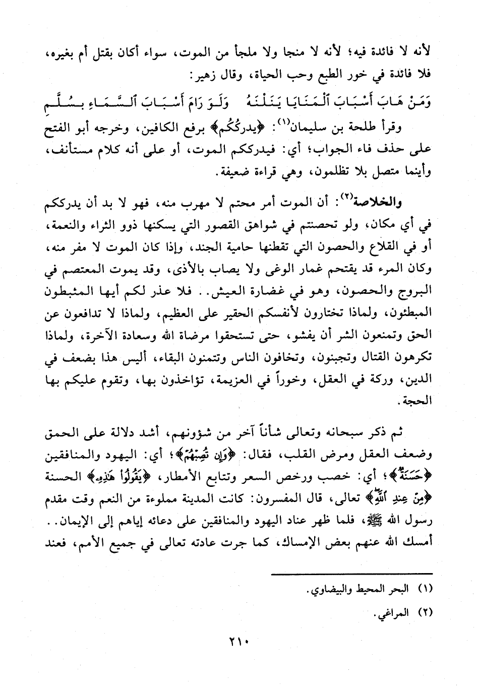 والخلاصة (¬2): أن الموت أمر محتم لا مهرب منه، فهو لا بد أن يدرككم في أي مكان، ولو تحصنتم في شواهق القصور التي يسكنها ذوو الثراء والنعمة، أو في القلاع والحصون التي تقطنها حامية الجند، وإذا كان الموت لا مفر منه، وكان المرء قد يقتحم غمار الوغى ولا يصاب بالأذى، وقد يموت المعتصم في البروج والحصون، وهو في غضارة العيش .. فلا عذر لكم أيها المثبطون المبطئون، ولماذا تختارون لأنفسكم الحقير على العظيم، ولماذا لا تدافعون عن الحق وتمنعون الشر أن يفشو، حتى تستحقوا مرضاة الله وسعادة الآخرة، ولماذا تكرهون القتال وتجبنون، وتخافون الناس وتتمنون البقاء، أليس هذا بضعف في الدين، وركة في العقل، وخورًا في العزيمة، تؤاخذون بها، وتقوم عليكم بها الحجة.