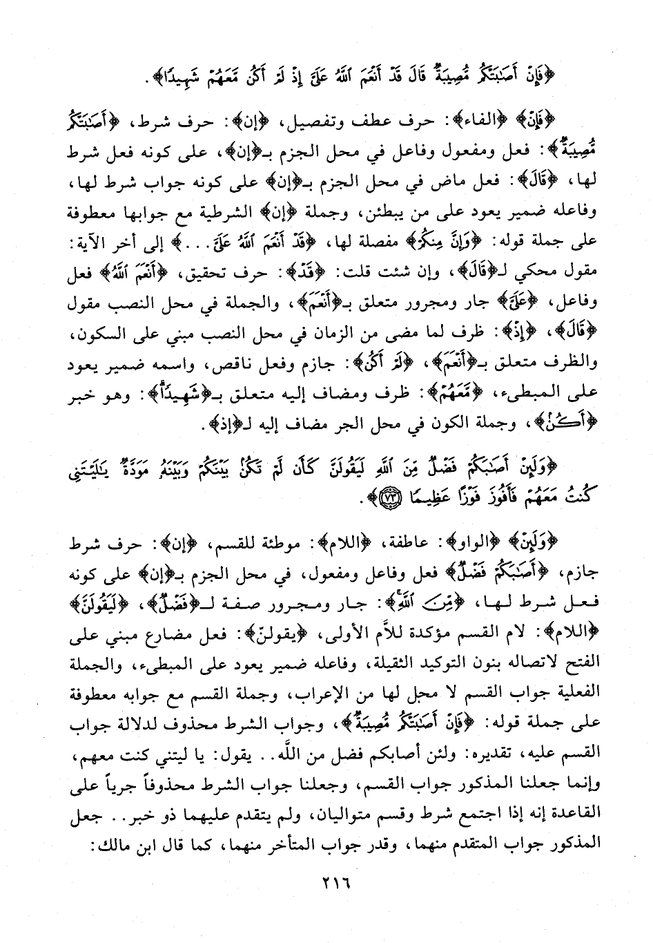 {فَإِنْ} {الفاء}: حرف عطف وتفصيل، {إن}: حرف شرط، {أَصَابَتْكُمْ مُصِيبَةٌ}: فعل ومفعول وفاعل في محل الجزم بـ {إن}، على كونه فعل شرط لها، {قَال}: فعل ماض في محل الجزم بـ {إن} على كونه جواب شرط لها، وفاعله ضمير يعود على من يبطئن، وجملة {إن} الشرطية مع جوابها معطوفة على جملة قوله: {وَإِنَّ مِنْكُمْ} مفصلة لها، {قَدْ أَنْعَمَ اللَّهُ عَلَيَّ ...} إلى أخر الآية: مقول محكي لـ {قَالَ}، وإن شئت قلت: {قَدْ}: حرف تحقيق، {أَنْعَمَ اللَّهُ} فعل وفاعل، {عَلَيَّ} جار ومجرور متعلق بـ {أَنْعَمَ}، والجملة في محل النصب مقول {قَالَ}، {إِذْ}: ظرف لما مضى من الزمان في محل النصب مبني على السكون، والظرف متعلق بـ {أَنْعَمَ}، {لَمْ أَكُنْ}: جازم وفعل ناقص، واسمه ضمير يعود على المبطىء، {مَعَهُمْ}: ظرف ومضاف إليه متعلق بـ {شَهِيدًا}: وهو خبر {أَكُنْ}، وجملة الكون في محل الجر مضاف إليه لـ {إِذْ}.