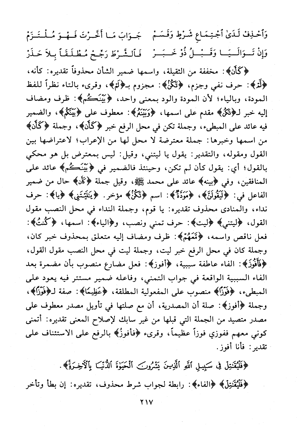 {كَأَنْ}: مخففة من الثقيلة، واسمها ضمير الشأن محذوفًا تقديره: كأنه، {لمْ}: حرف نفي وجزم، {تَكُنْ}: مجزوم بـ {لَم}، وقرىء بالتاء نظرًا للفظ المودة، وبالياء؛ لأن المودة والود بمعنى واحد، {بَيْنَكُمْ}: ظرف ومضاف إليه خبر لـ {تَكُنْ} ومقدم على اسمها، {وَبَيْنَه}: معطوف على {بَيْنَكُمْ}، والضمير فيه عائد على المبطىء، وجملة تكن في محل الرفع خبر {كَأَنْ}، وجملة {كَأَنْ} من اسمها وخبرها: جملة معترضة لا محل لها من الإعراب؛ لاعتراضها بين القول ومقوله، والتقدير: يقول يا ليتني، وقيل: ليس بمعترض بل هو محكي بالقول؛ أي: يقول كأن لم تكن، وحينئذ فالضمير في {بَيْنَكُمْ} عائد على المنافقين، وفي {بَيْنَهُ} عائد على محمَّد - صلى الله عليه وسلم -، وقيل جملة {كَأَنْ} حال من ضمير الفاعل في: {لَيَقُولَنَّ}، {مَوَدَّةٌ}: اسم {تَكُنْ} مؤخر. {يَا لَيْتَنِي} {يَا}: حرف نداء، والمنادى محذوف تقديره: يا قوم، وجملة النداء في محل النصب مقول القول، {لَيْتَنِي} {ليت}: حرف تمني ونصب، و {الياء}: اسمها، {كُنتُ}: فعل ناقص واسمه، {مَعَهُمْ}: ظرف ومضاف إليه متعلق بمحذوف خبر كان، وجملة كان في محل الرفع خبر ليت، وجملة ليت في محل النصب مقول القول، {فَأَفُوز}: الفاء عاطفة سببية، {أفوز}: فعل مضارع منصوب بأن مضمرة بعد الفاء السببية الواقعة في جواب التمني، وفاعله ضمير مستتر فيه يعود على المبطىء، {فَوْزًا} منصوب على المفعولية المطلقة، {عَظِيمًا}: صفة لـ {فَوْزًا}، وجملة {أفوزَ}: صلة أن المصدرية، أن مع صلتها في تأويل مصدر معطوف على مصدر متصيد من الجملة التي قبلها من غير سابك لإصلاح المعنى تقديره: أتمنى كوني معهم ففوزي فوزًا عظيمًا، وقرىء {فأفوزُ} بالرفع على الاستئناف على تقدير: فأنا أفوز.