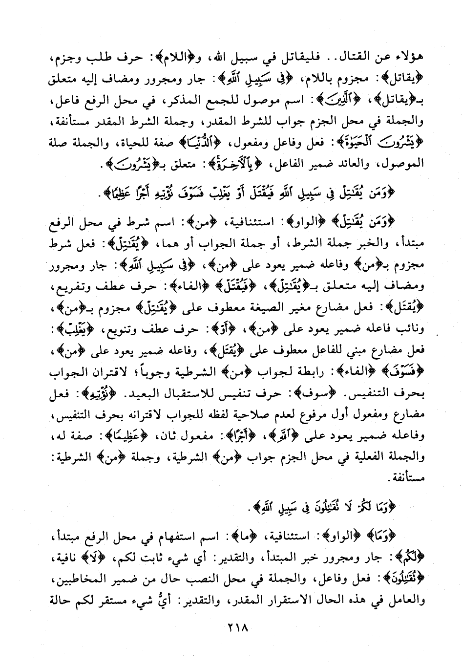 {وَمَنْ يُقَاتِلْ} {الواو}: استئنافية، {من}: اسم شرط في محل الرفع مبتدأ، والخبر جملة الشرط، أو جملة الجواب أو هما، {يُقَاتِلْ}: فعل شرط مجزوم بـ {من} وفاعله ضمير يعود على {من}، {فِي سَبِيلِ اللَّهِ}: جار ومجرور ومضاف إليه متعلق بـ {يُقَاتِلْ}، {فَيُقْتَلْ} {الفاء}: حرف عطف وتفريع، {يُقْتَلْ}: فعل مضارع مغير الصيغة معطوف على {يُقاتل} مجزوم بـ {من}، ونائب فاعله ضمير يعود على {من}، {أَوْ}: حرف عطف وتنويع، {يَغْلِبْ}: فعل مضارع مبني للفاعل معطوف على {يُقْتَلْ}، وفاعله ضمير يعود على {مَنْ}، {فَسَوْفَ} {الفاء}: رابطة لجواب {من} الشرطية وجوبًا؛ لاقتران الجواب بحرف التنفيس. {سوف}: حرف تنفيس للاستقبال البعيد. {نُؤْتِيهِ}: فعل مضارع ومفعول أول مرفوع لعدم صلاحية لفظه للجواب لاقترانه بحرف التنفيس، وفاعله ضمير يعود على {الله}، {أجرًا}: مفعول ثان، {عَظِيمًا}: صفة له، والجملة الفعلية في محل الجزم جواب {من} الشرطية، وجملة {من} الشرطية: مستأنفة.