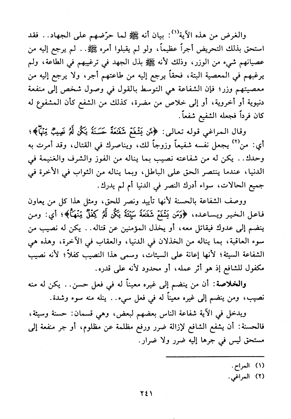 والغرض من هذه الآية (¬1): بيان أنه - صلى الله عليه وسلم - لما حرّضهم على الجهاد .. فقد استحق بذلك التحريض أجرًا عظيمًا، ولو لم يقبلوا أمره - صلى الله عليه وسلم - .. لم يرجع إليه من عصيانهم شيء من الوزر، وذلك لأنه - صلى الله عليه وسلم - بذل الجهد في ترغيبهم في الطاعة، ولم يرغبهم في المعصية البتة، فحقًّا يرجع إليه من طاعتهم أجر، ولا يرجع إليه من معصيتهم وزر؛ فإن الشفاعة هي التوسط بالقول في وصول شخص إلى منفعة دنيوية أو أخروية، أو إلى خلاص من مضرة، كذلك من الشفع كان المشفوع له كان فردًا فجعله الشفيع شفعًا.