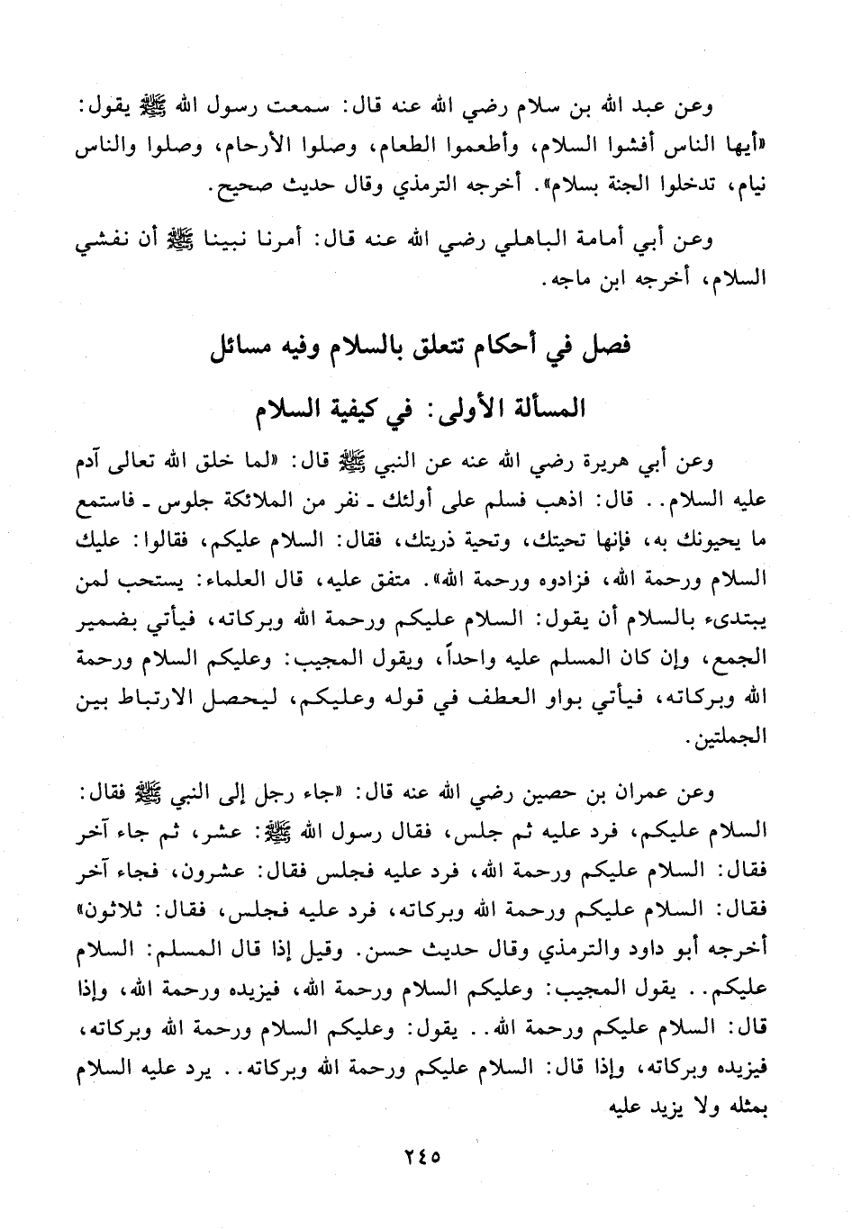 وعن عمران بن حصين رضي الله عنه قال: "جاء رجل إلى النبي - صلى الله عليه وسلم - فقال: السلام عليكم، فرد عليه ثم جلس، فقال رسول الله - صلى الله عليه وسلم -: عشر، ثم جاء آخر فقال: السلام عليكم ورحمة الله، فرد عليه فجلس فقال: عشرون، فجاء آخر فقال: السلام عليكم ورحمة الله وبركاته، فرد عليه فجلس، فقال: ثلاثون" أخرجه أبو داود والترمذي وقال حديث حسن. وقيل إذا قال المسلم: السلام عليكم .. يقول المجيب: وعليكم السلام ورحمة الله، فيزيده ورحمة الله، وإذا قال: السلام عليكم ورحمة الله .. يقول: وعليكم السلام ورحمة الله وبركاته، فيزيده وبركاته، وإذا قال: السلام عليكم ورحمة الله وبركاته .. يرد عليه السلام بمثله ولا يزيد عليه.