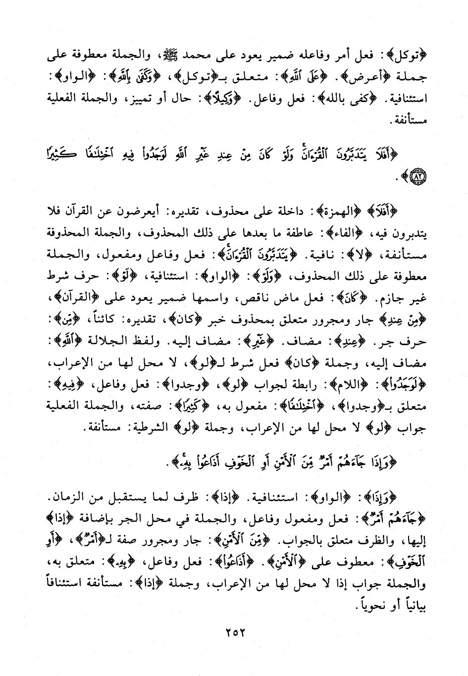 {أَفَلَا} {الهمزة}: داخلة على محذوف، تقديره: أيعرضون عن القرآن فلا يتدبرون فيه، {الفاء}: عاطفة ما بعدها على ذلك المحذوف، والجملة المحذوفة مستأنفة، {لا}: نافية. {يَتَدَبَّرُونَ الْقُرْآنَ}: فعل وفاعل ومفعول، والجملة معطوفة على ذلك المحذوف، {وَلَوْ}: {الواو}: استئنافية، {لوْ}: حرف شرط غير جازم. {كَانَ}: فعل ماض ناقص، واسمها ضمير يعود على {القرآن}، {مِنْ عِندِ} جار ومجرور متعلق بمحذوف خبر {كان}، تقديره: كائنًا، {مِنْ}: حرف جر. {عِنْدِ}: مضاف. {غَيْرِ}: مضاف إليه. ولفظ الجلالة {اللَّهِ}: مضاف إليه، وجملة {كان} فعل شرط لـ {لو}، لا محل لها من الإعراب، {لَوَجَدُوا}: {اللام}: رابطة لجواب {لو}، {وجدوا}: فعل وفاعل، {فِيهِ}: متعلق بـ {وجدوا}، {اخْتِلَافًا}: مفعول به، {كَثِيرًا}: صفته، والجملة الفعلية جواب {لو} لا محل لها من الإعراب، وجملة {لو} الشرطية: مستأنفة.
