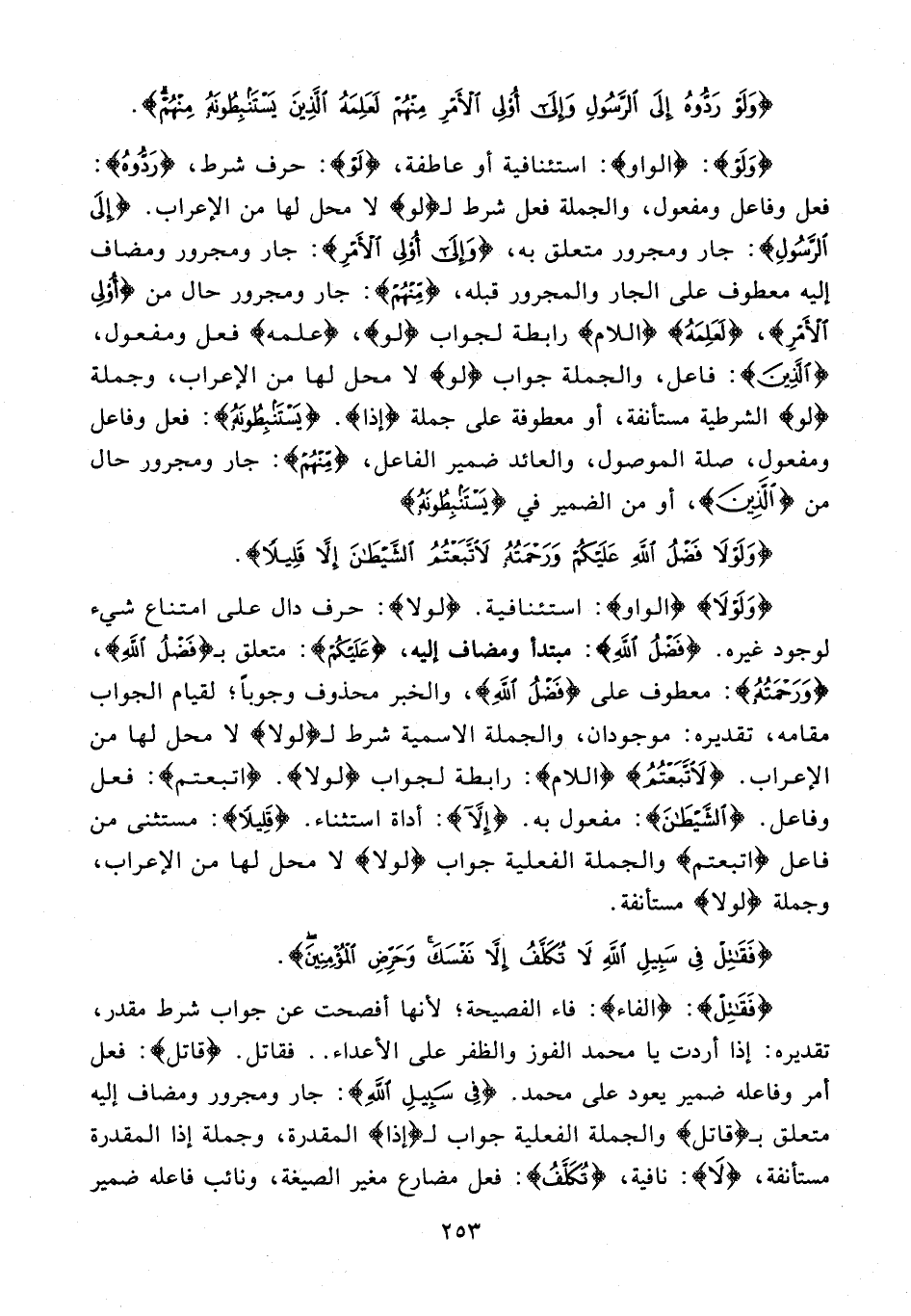 {وَلَوْلَا} {الواو}: استئنافية. {لولا}: حرف دال على امتناع شيء لوجود غيره. {فَضْلُ اللَّهِ}: مبتدأ ومضاف إليه، {عَلَيْكُمْ}: متعلق بـ {فَضْلُ اللَّهِ}، {وَرَحْمَتُهُ}: معطوف على {فَضْلُ اللَّهِ}، والخبر محذوف وجوبًا؛ لقيام الجواب مقامه، تقديره: موجودان، والجملة الإسمية شرط لـ {لولا} لا محل لها من الإعراب. {لَاتَّبَعْتُمُ} {اللام}: رابطة لجواب {لولا}. {اتبعتم}: فعل وفاعل. {الشَّيْطَانَ}: مفعول به. {إِلَّا}: أداة استثناء. {قَلِيلًا}: مستثنى من فاعل {اتَّبَعْتُمُ} والجملة الفعلية جواب {لولا} لا محل لها من الإعراب، وجملة {لولا} مستأنفة.
