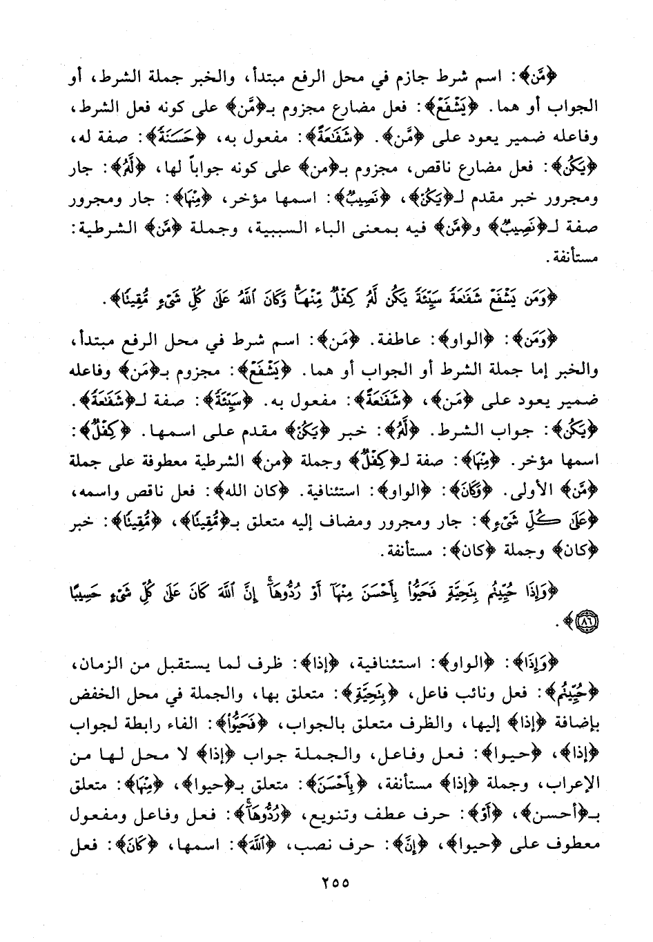 {مَّنْ}: اسم شرط جازم في محل الرفع مبتدأ، والخبر جملة الشرط، أو الجواب أو هما. {يَشْفَعْ}: فعل مضارع مجزوم بـ {مَنْ} على كونه فعل الشرط، وفاعله ضمير يعود على {مَّنْ}. {شَفَاعَةً}: مفعول به، {حَسَنَةً}: صفة له، {يَكُنْ}: فعل مضارع ناقص، مجزوم بـ {من} على كونه جوابًا لها، {لَهُ}: جار ومجرور خبر مقدم لـ {يَكُنْ}، {نَصِيبٌ}: اسمها مؤخر، {مِنْهَا}: جار ومجرور صفة لـ {نَصِيبٌ} و {مَنْ} فيه بمعنى الباء السببية، وجملة {مَنْ} الشرطية: مستأنفة.
