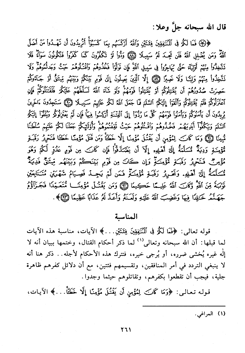 {فَمَا لَكُمْ فِي الْمُنَافِقِينَ فِئَتَيْنِ وَاللَّهُ أَرْكَسَهُمْ بِمَا كَسَبُوا أَتُرِيدُونَ أَنْ تَهْدُوا مَنْ أَضَلَّ اللَّهُ وَمَنْ يُضْلِلِ اللَّهُ فَلَنْ تَجِدَ لَهُ سَبِيلًا (88) وَدُّوا لَوْ تَكْفُرُونَ كَمَا كَفَرُوا فَتَكُونُونَ سَوَاءً فَلَا تَتَّخِذُوا مِنْهُمْ أَوْلِيَاءَ حَتَّى يُهَاجِرُوا فِي سَبِيلِ اللَّهِ فَإِنْ تَوَلَّوْا فَخُذُوهُمْ وَاقْتُلُوهُمْ حَيْثُ وَجَدْتُمُوهُمْ وَلَا تَتَّخِذُوا مِنْهُمْ وَلِيًّا وَلَا نَصِيرًا (89) إِلَّا الَّذِينَ يَصِلُونَ إِلَى قَوْمٍ بَيْنَكُمْ وَبَيْنَهُمْ مِيثَاقٌ أَوْ جَاءُوكُمْ حَصِرَتْ صُدُورُهُمْ أَنْ يُقَاتِلُوكُمْ أَوْ يُقَاتِلُوا قَوْمَهُمْ وَلَوْ شَاءَ اللَّهُ لَسَلَّطَهُمْ عَلَيْكُمْ فَلَقَاتَلُوكُمْ فَإِنِ اعْتَزَلُوكُمْ فَلَمْ يُقَاتِلُوكُمْ وَأَلْقَوْا إِلَيْكُمُ السَّلَمَ فَمَا جَعَلَ اللَّهُ لَكُمْ عَلَيْهِمْ سَبِيلًا (90) سَتَجِدُونَ آخَرِينَ يُرِيدُونَ أَنْ يَأْمَنُوكُمْ وَيَأْمَنُوا قَوْمَهُمْ كُلَّ مَا رُدُّوا إِلَى الْفِتْنَةِ أُرْكِسُوا فِيهَا فَإِنْ لَمْ يَعْتَزِلُوكُمْ وَيُلْقُوا إِلَيْكُمُ السَّلَمَ وَيَكُفُّوا أَيْدِيَهُمْ فَخُذُوهُمْ وَاقْتُلُوهُمْ حَيْثُ ثَقِفْتُمُوهُمْ وَأُولَئِكُمْ جَعَلْنَا لَكُمْ عَلَيْهِمْ سُلْطَانًا مُبِينًا (91) وَمَا كَانَ لِمُؤْمِنٍ أَنْ يَقْتُلَ مُؤْمِنًا إِلَّا خَطَأً وَمَنْ قَتَلَ مُؤْمِنًا خَطَأً فَتَحْرِيرُ رَقَبَةٍ مُؤْمِنَةٍ وَدِيَةٌ مُسَلَّمَةٌ إِلَى أَهْلِهِ إِلَّا أَنْ يَصَّدَّقُوا فَإِنْ كَانَ مِنْ قَوْمٍ عَدُوٍّ لَكُمْ وَهُوَ مُؤْمِنٌ فَتَحْرِيرُ رَقَبَةٍ مُؤْمِنَةٍ وَإِنْ كَانَ مِنْ قَوْمٍ بَيْنَكُمْ وَبَيْنَهُمْ مِيثَاقٌ فَدِيَةٌ مُسَلَّمَةٌ إِلَى أَهْلِهِ وَتَحْرِيرُ رَقَبَةٍ مُؤْمِنَةٍ فَمَنْ لَمْ يَجِدْ فَصِيَامُ شَهْرَيْنِ مُتَتَابِعَيْنِ تَوْبَةً مِنَ اللَّهِ وَكَانَ اللَّهُ عَلِيمًا حَكِيمًا (92) وَمَنْ يَقْتُلْ مُؤْمِنًا مُتَعَمِّدًا فَجَزَاؤُهُ جَهَنَّمُ خَالِدًا فِيهَا وَغَضِبَ اللَّهُ عَلَيْهِ وَلَعَنَهُ وَأَعَدَّ لَهُ عَذَابًا عَظِيمًا (93)}.
