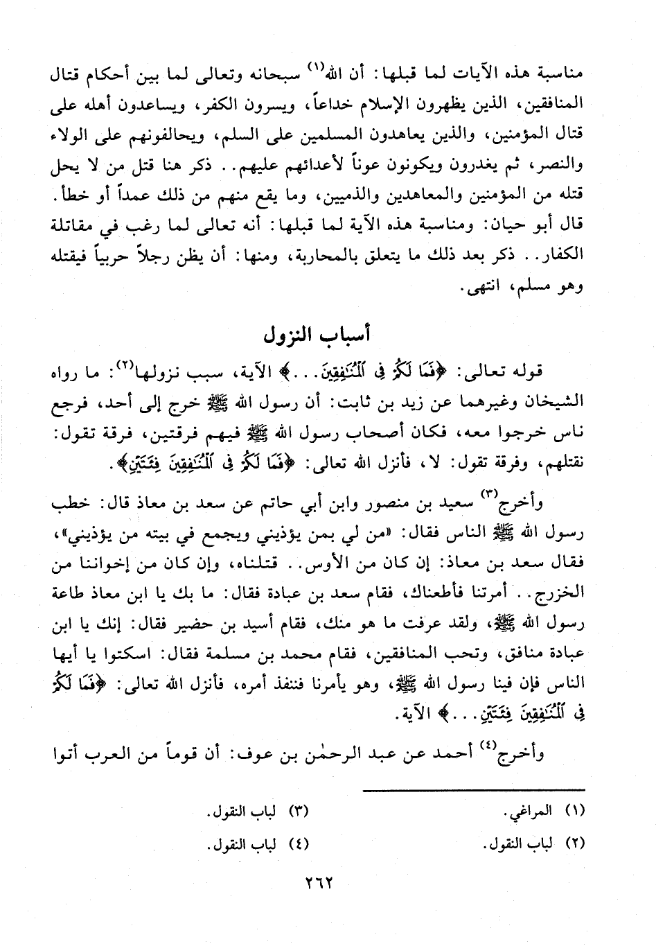 قوله تعالى: {فَمَا لَكُمْ فِي الْمُنَافِقِينَ ...} الآية، سبب نزولها (¬2): ما رواه الشيخان وغيرهما عن زيد بن ثابت: أن رسول الله - صلى الله عليه وسلم - خرج إلى أحد، فرجع ناس خرجوا معه، فكان أصحاب رسول الله - صلى الله عليه وسلم - فيهم فرقتين، فرقة تقول: نقتلهم، وفرقة تقول: لا، فأنزل الله تعالى: {فَمَا لَكُمْ فِي الْمُنَافِقِينَ فِئَتَيْنِ}.
