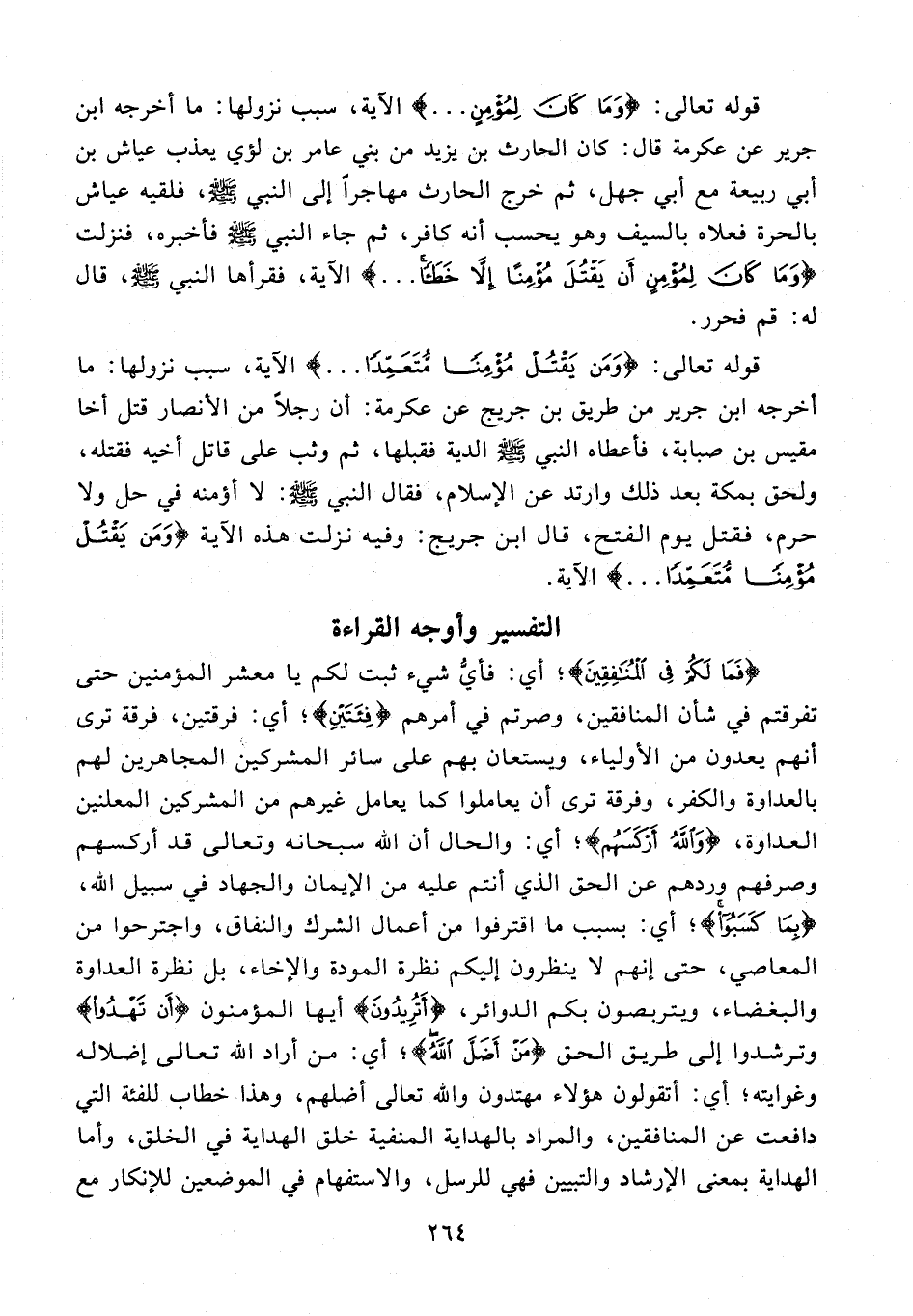 88 - {فَمَا لَكُمْ فِي الْمُنَافِقِينَ}؛ أي: فأيُّ شيء ثبت لكم يا معشر المؤمنين حتى تفرقتم في شأن المنافقين، وصرتم في أمرهم {فِئَتَيْنِ}؛ أي: فرقتين، فرقة ترى أنهم يعدون من الأولياء، ويستعان بهم على سائر المشركين المجاهرين لهم بالعداوة والكفر، وفرقة ترى أن يعاملوا كما يعامل غيرهم من المشركين المعلنين العداوة، {وَاللَّهُ أَرْكَسَهُمْ}؛ أي: والحال أن الله سبحانه وتعالى قد أركسهم وصرفهم وردهم عن الحق الذي أنتم عليه من الإيمان والجهاد في سبيل الله، {بِمَا كَسَبُوا}؛ أي: بسبب ما اقترفوا من أعمال الشرك والنفاق، واجترحوا من المعاصي، حتى إنهم لا ينظرون إليكم نظرة المودة والإخاء، بل نظرة العداوة والبغضاء، ويتربصون بكم الدوائر، {أَتُرِيدُونَ} أيها المؤمنون {أَنْ تَهْدُوا} وترشدوا إلى طريق الحق {مَنْ أَضَلَّ اللَّهُ}؛ أي: من أراد الله تعالى إضلاله وغوايته؛ أي: أتقولون هؤلاء مهتدون والله تعالى أضلهم، وهذا خطاب للفئة التي دافع عن المنافقين، والمراد بالهداية المنفية خلق الهداية في الخلق، وأما الهداية بمعنى الإرشاد والتبيين فهي للرسل، والاستفهام في الموضعين للإنكار مع