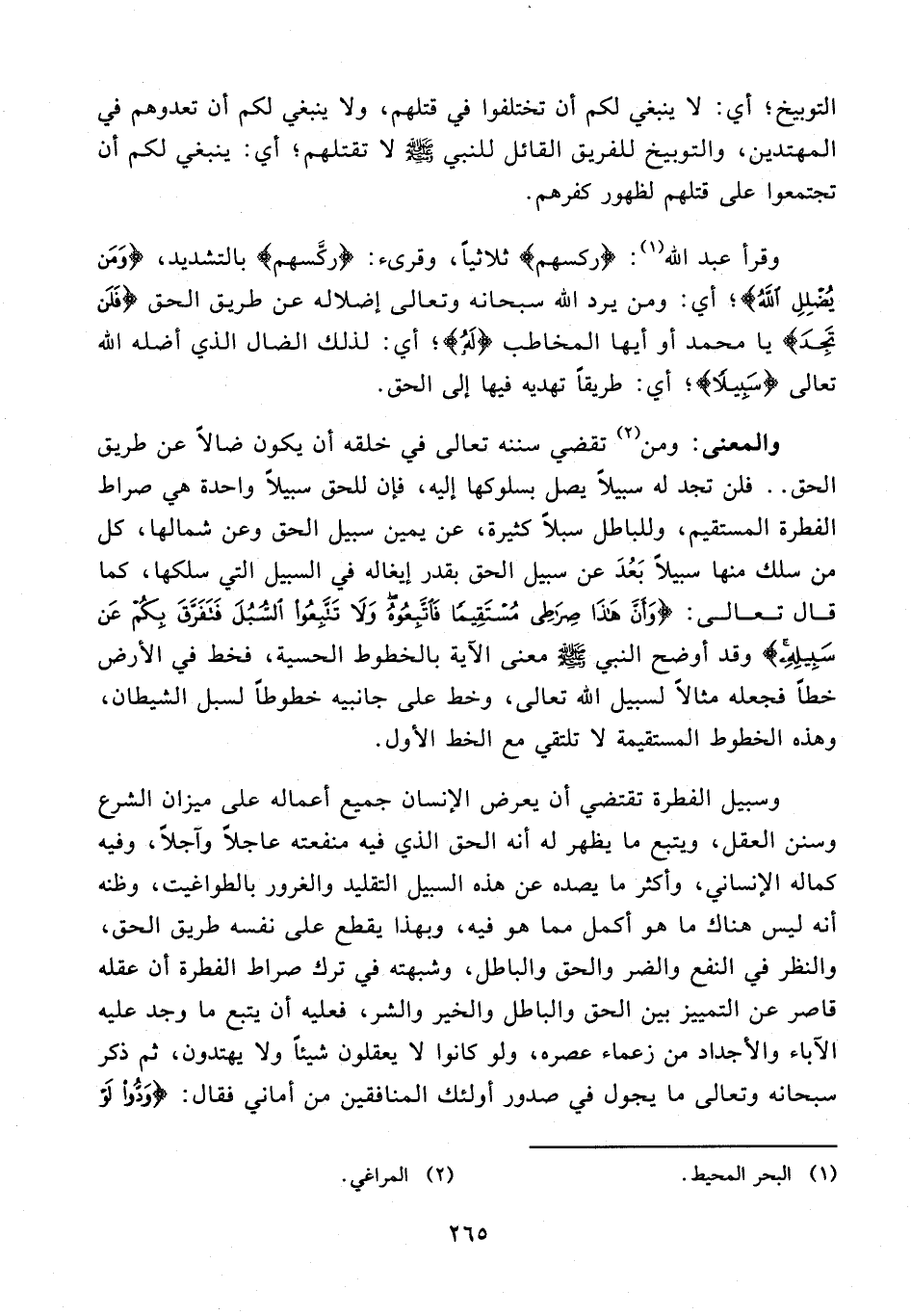 والمعنى: ومن (¬2) تقضي سننه تعالى في خلقه أن يكون ضالًا عن طريق الحق .. فلن تجد له سبيلًا يصل بسلوكها إليه، فإن للحق سبيلًا واحدة هي صراط الفطرة المستقيم، وللباطل سبلًا كثيرة، عن يمين سبيل الحق وعن شمالها، كل من سلك منها سبيلًا بَعُدَ عن سبيل الحق بقدر إيغاله في السبيل التي سلكها، كما قال تعالى: {وَأَنَّ هَذَا صِرَاطِي مُسْتَقِيمًا فَاتَّبِعُوهُ وَلَا تَتَّبِعُوا السُّبُلَ فَتَفَرَّقَ بِكُمْ عَنْ سَبِيلِهِ} وقد أوضح النبي - صلى الله عليه وسلم - معنى الآية بالخطوط الحسية، فخط في الأرض خطًّا فجعله مثالًا لسبيل الله تعالى، وخط على جانبيه خطوطًا لسبل الشيطان، وهذه الخطوط المستقيمة لا تلتقي مع الخط الأول.