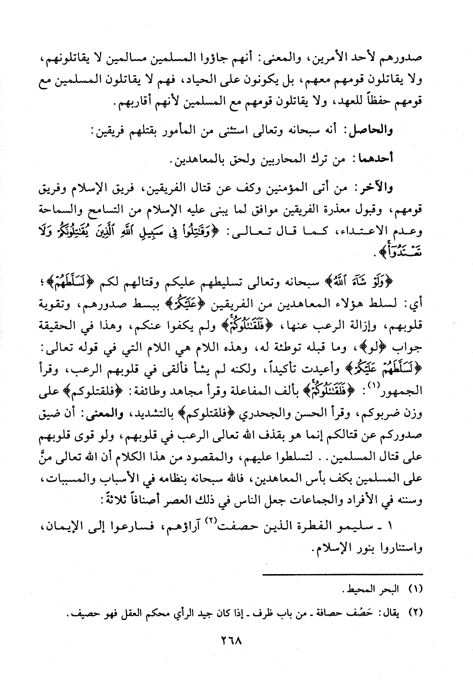 صدورهم لأحد الأمرين، والمعنى: أنهم جاؤوا المسلمين مسالمين لا يقاتلونهم، ولا يقاتلون قومهم معهم، بل يكونون على الحياد، فهم لا يقاتلون المسلمين مع قومهم حفظًا للعهد، ولا يقاتلون قومهم مع المسلمين لأنهم أقاربهم.