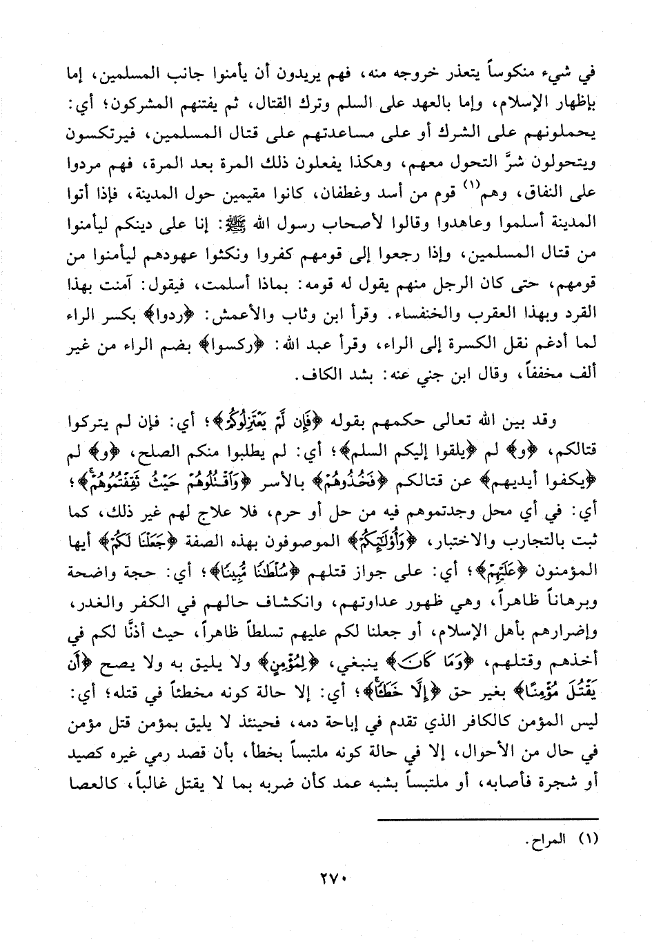 في شيء منكوسًا يتعذر خروجه منه، فهم يريدون أن يأمنوا جانب المسلمين، إما بإظهار الإِسلام، وإما بالعهد على السلم وترك القتال، ثم يفتنهم المشركون؛ أي: يحملونهم على الشرك أو على مساعدتهم على قتال المسلمين، فيرتكسون ويتحولون شرَّ التحول معهم، وهكذا يفعلون ذلك المرة بعد المرة، فهم مردوا على النفاق، وهم (¬1) قوم من أسد وغطفان، كانوا مقيمين حول المدينة، فإذا أتوا المدينة أسلموا وعاهدوا وقالوا لأصحاب رسول الله - صلى الله عليه وسلم -: إنا على دينكم ليأمنوا من قتال المسلمين، وإذا رجعوا إلى قومهم كفروا ونكثوا عهودهم ليأمنوا من قومهم، حتى كان الرجل منهم يقول له قومه: بماذا أسلمت، فيقول: آمنت بهذا القرد وبهذا العقرب والخنفساء. وقرأ ابن وثاب والأعمش: {ردوا} بكسر الراء لما أدغم نقل الكسرة إلى الراء، وقرأ عبد الله: {ركسوا} بضم الراء من غير ألف مخففًا، وقال ابن جني عنه: بشد الكاف.