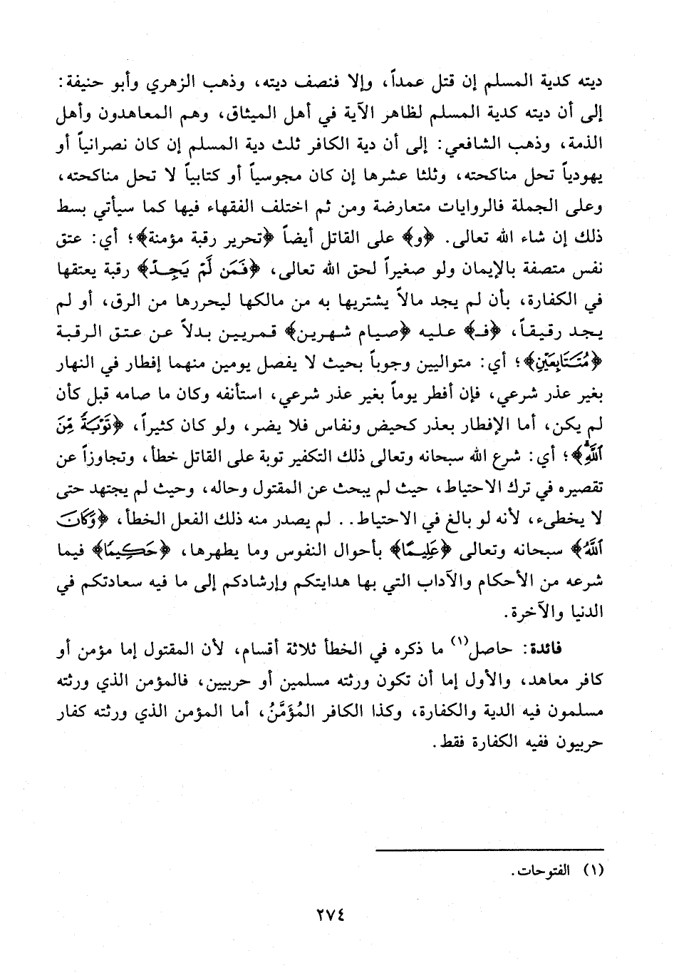 ديته كدية المسلم إن قتل عمدًا، وإلا فنصف ديته، وذهب الزهري وأبو حنيفة: إلى أن ديته كدية المسلم لظاهر الآية في أهل الميثاق، وهم المعاهدون وأهل الذمة، وذهب الشافعي: إلى أن دية الكافر ثلث دية المسلم إن كان نصرانيًّا أو يهوديًّا تحل مناكحته، وثلثا عشرها إن كان مجوسيًّا أو كتابيًّا لا تحل مناكحته، وعلى الجملة فالروايات متعارضة ومن ثم اختلف الفقهاء فيها كما سيأتي بسط ذلك إن شاء الله تعالى. {و} على القاتل أيضًا {تحرير رقبة مؤمنة} أي: عتق نفس متصفة بالإيمان ولو صغيرًا لحق الله تعالى، {فَمَنْ لَمْ يَجِدْ} رقبة يعتقها في الكفارة، بأن لم يجد مالًا يشتريها به من مالكها ليحررها من الرق، أو لم يجد رقيقًا، {فـ} عليه {صيام شهرين} قمريين بدلًا عن عتق الرقبة {مُتَتَابِعَيْنِ}؛ أي: متواليين وجوبًا بحيث لا يفصل يومين منهما إفطار في النهار بغير عذر شرعي، فإن أفطر يومًا بغير عذر شرعي، استأنفه وكان ما صامه قبل كأن لم يكن، أما الإفطار بعذر كحيض ونفاس فلا يضر، ولو كان كثيرًا، {تَوْبَةً مِنَ اللَّهِ}؛ أي: شرع الله سبحانه وتعالى ذلك التكفير توبة على القاتل خطأ، وتجاوزًا عن تقصيره في ترك الاحتياط، حيث لم يبحث عن المقتول وحاله، وحيث لم يجتهد حتى لا يخطيء، لأنه لو بالغ في الاحتياط .. لم يصدر منه ذلك الفعل الخطأ، {وَكاَنَ الَّلهُ} سبحانه وتعالى {عَلِيمًا} بأحوال النفوس وما يطهرها، {حَكِيمًا} فيما شرعه من الأحكام والآداب التي بها هدايتكم وإرشادكم إلى ما فيه سعادتكم في الدنيا والآخرة.
