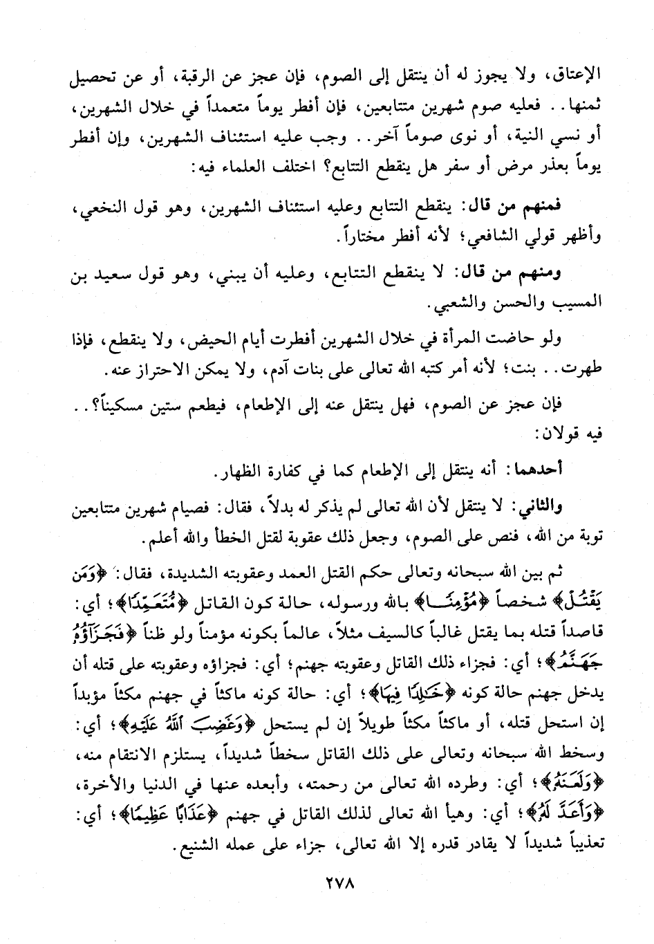 الإعتاق، ولا يجوز له أن ينتقل إلى الصوم، فإن عجز عن الرقبة، أو عن تحصيل ثمنها .. فعليه صوم شهرين متتابعين، فإن أفطر يومًا متعمدًا في خلال الشهرين، أو نسي النية، أو نوى صومًا آخر .. وجب عليه استئناف الشهرين، وإن أفطر يومًا بعذر مرض أو سفر هل ينقطع التتابع؟ اختلف العلماء فيه: