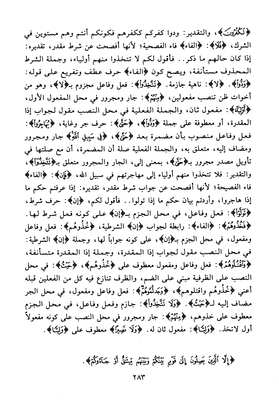 {تَكْفُرُونَ}، والتقدير: ودوا كفركم ككفرهم فكونكم أنتم وهم مستوين في الشرك، {فَلَا}: {الفاء} فاء الفصحية؛ لأنها أفصحت عن شرط مقدر، تقديره: إذا كان حالهم ما ذكر .. فأقول لكم لا تتخذوا منهم أولياء، وجملة الشرط المحذوف مستأنفة، ويصح كون {الفاء} حرف عطف وتفريع على قوله: {وَدُّوا}. {لا}: ناهية جازمة. {تَتَّخِذُوا}: فعل وفاعل مجزوم بـ {لا}، وهو من أخوات ظن تنصب مفعولين، {مِنْهُمْ}: جار ومجرور في محل المفعول الأول، {أَوْلِيَاءَ}: مفعول ثان، والجملة الفعلية في محل النصب مقول لجواب إذا المقدرة، أو معطوفة على جملة {وَدُّوا}، {حَتَّى}: حرف جر وغاية، {يُهَاجِرُوا}: فعل وفاعل منصوب بأن مضمرة بعد {حَتَّى}، {فِي سَبِيلِ اللَّهِ} جار ومجرور ومضاف إليه، متعلق به، والجملة الفعلية صلة أن المضمرة، أن مع صلتها في تأويل مصدر مجرور بـ {حَتَّى}، بمعنى إلى، الجار والمجرور متعلق بـ {تَتَّخِذُوا}، والتقدير: فلا تتخذوا منهم أولياء إلى مهاجرتهم في سبيل الله، {فَإِنْ}: {الفاء} فاء الفصيحة؛ لأنها أفصحت عن جواب شرط مقدر، تقديره: إذا عرفتم حكم ما إذا هاجروا، وأردتم بيان حكم ما إذا تولوا .. فأقول لكم، {إن}: حرف شرط، {تَوَلَّوْا}: فعل وفاعل، في محل الجزم بـ {إن} على كونه فعل شرط لها. {فَخُذُوهُمْ}: {الفاء}: رابطة لجواب {إن} الشرطية، {خُذُوهُمْ}: فعل وفاعل ومفعول، في محل الجزم بـ {إن}، على كونه جوابًا لها، وجملة {إن} الشرطية: في محل النصب مقول لجواب إذا المقدرة، وجملة إذا المقدرة متسأنفة، {وَاقْتُلُوهُمْ}: فعل وفاعل ومفعول معطوف على {خُذُوهُمْ}، {حَيْثُ}: في محل النصب على الظرفية مبني على الضم، والظرف تنازع فيه كل من الفعلين قبله أعني {خُذُوهُمْ وَاقْتُلُوهُمْ}، {وَجَدْتُمُوهُمْ}: فعل وفاعل ومفعول، في محل الجر مضاف إليه لـ {حَيْثُ}. {وَلَا تَتَّخِذُوا}: جازم وفعل وفاعل، في محل الجزم معطوف على خذوهم، {مِنْهُمْ}: جار ومجرور في محل النصب على كونه مفعولًا أول لاتخذ. {وَلِيًّا}: مفعول ثان له. {وَلَا نَصِيرًا} معطوف على {وَلِيًّا}.