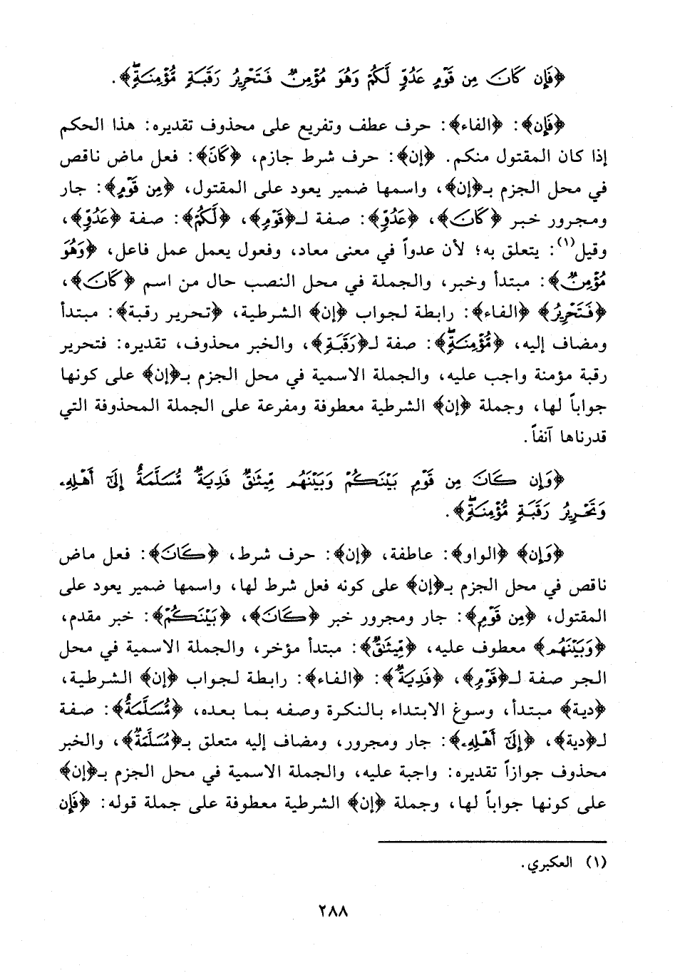 {فَإن}: {الفاء}: حرف عطف وتفريع على محذوف تقديره: هذا الحكم إذا كان المقتول منكم. {إن}: حرف شرط جازم، {كَانَ}: فعل ماض ناقص في محل الجزم بـ {إن}، واسمها ضمير يعود على المقتول، {مِنْ قَوْمٍ}: جار ومجرور خبر {كاَنَ}، {عَدُوٍّ}: صفة لـ {قَوْمٍ}، {لَكُمْ}: صفة {عَدُوّ}، وقيل (¬1): يتعلق به؛ لأن عدوًّا في معنى معاد، وفعول يعمل عمل فاعل، {وَهُوَ مُؤْمِنٌ}: مبتدأ وخبر، والجملة في محل النصب حال من اسم {كَانَ}، {فَتَحْرِيرُ} {الفاء}: رابطة لجواب {إن} الشرطية، {تحرير رقبة}: مبتدأ ومضاف إليه، {مُؤْمِنَةٍ}: صفة لـ {رَقَبَةٍ}، والخبر محذوف، تقديره: فتحرير رقبة مؤمنة واجب عليه، والجملة الإسمية في محل الجزم بـ {إن} على كونها جوابًا لها، وجملة {إن} الشرطية معطوفة ومفرعة على الجملة المحذوفة التي قدرناها آنفًا.