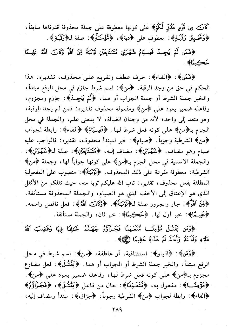 {فَمَن}: {الفاء}: حرف عطف وتفريع على محذوف، تقديره: هذا الحكم في حق من وجد الرقبة. {من}: اسم شرط جازم في محل الرفع مبتدأ، والخبر جملة الشرط أو جملة الجواب أو هما، {لَمْ يَجِدْ}: جازم ومجزوم، وفاعله ضمير يعود على {من} ومفعوله محذوف تقديره: فمن لم يجد الرقبة، وهو متعد إلى واحد؛ لأنه من وجدان الضالة، لا بمعنى علم، والجملة في محل الجزم بـ {من} على كونه فعل شرط لها. {فَصِيَامُ} {الفاء}: رابطة لجواب {من} الشرطية وجوبًا. {صيام}: خبر لمبتدأ محذوف، تقديره: فالواجب عليه صيام وهو مضاف. {شَهْرَيْنِ}: مضاف إليه، {مُتَتَابِعَيْنِ}: صفة لـ {شَهْرَيْنِ}، والجملة الإسمية في محل الجزم بـ {من} على كونها جوابًا لها، وجملة {من} الشرطية: معطوفة مفرعة على ذلك المحذوف. {تَوْبَةً}: منصوب على المفعولية المطلقة بفعل محذوف، تقديره: تاب الله عليكم توبة منه، حيث نقلكم من الأثقل الذي هو الإعتاق إلى الأخف الذي هو الصيام، والجملة المحذوفة مستأنفة. {مِنَ اللَّهِ}: جار ومجرور صفة لـ {تَوْبَةً}. {وَكَانَ اللَّهُ}: فعل ناقص واسمه. {عَلِيمًا}: خبر أول لها. {حَكِيمًا}: خبر ثان، والجملة مستأنفة.