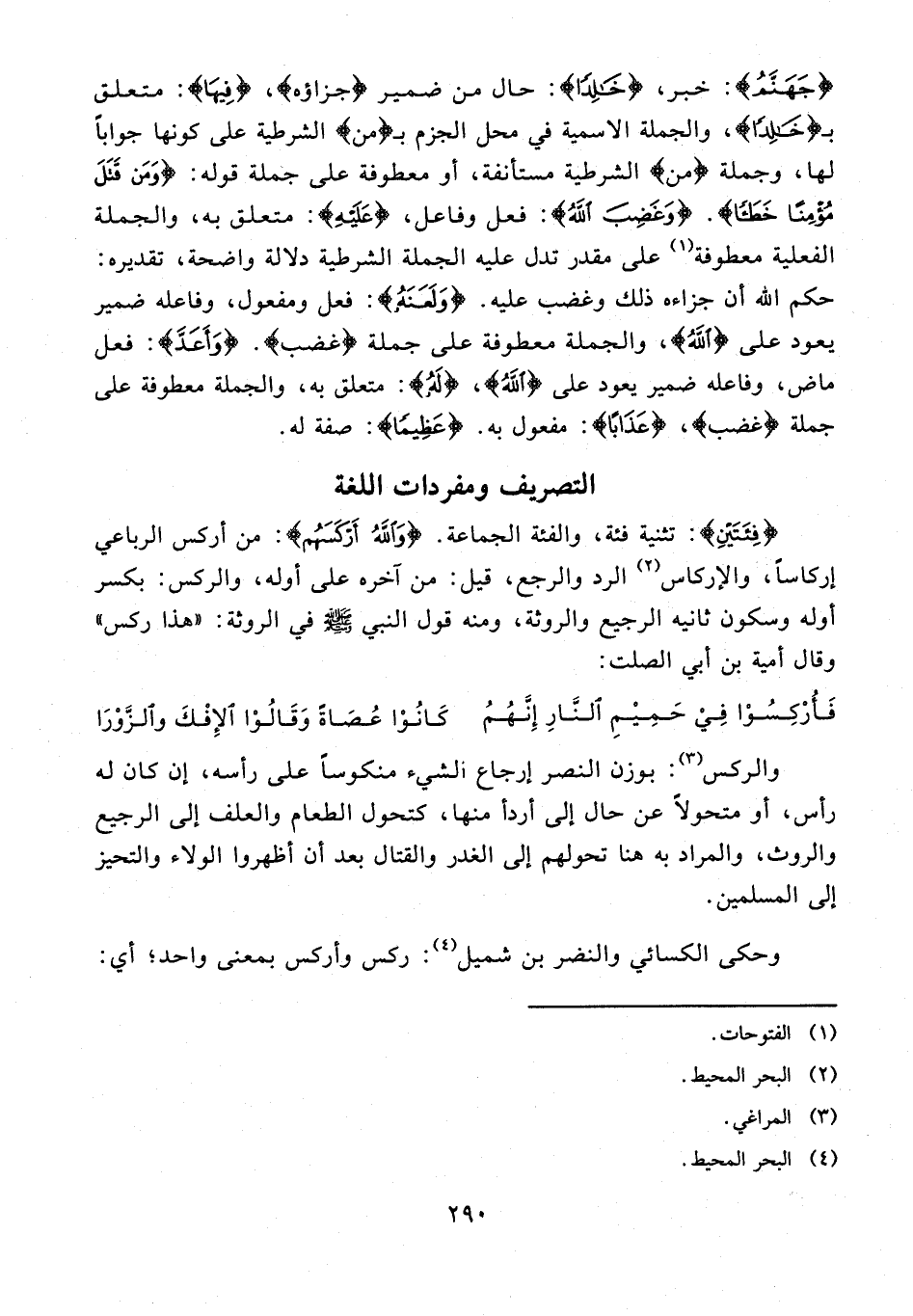 {فِئَتَيْنِ}: تثنية فئة، والفئة الجماعة. {وَاللَّهُ أَرْكَسَهُمْ}: من أركس الرباعي إركاسًا، والإركاس (¬2) الرد والرجع، قيل: من آخره على أوله، والركس: بكسر أوله وسكون ثانيه الرجيع والروثة، ومنه قول النبي - صلى الله عليه وسلم - في الروثة: "هذا ركس" وقال أمية بن أبي الصلت: