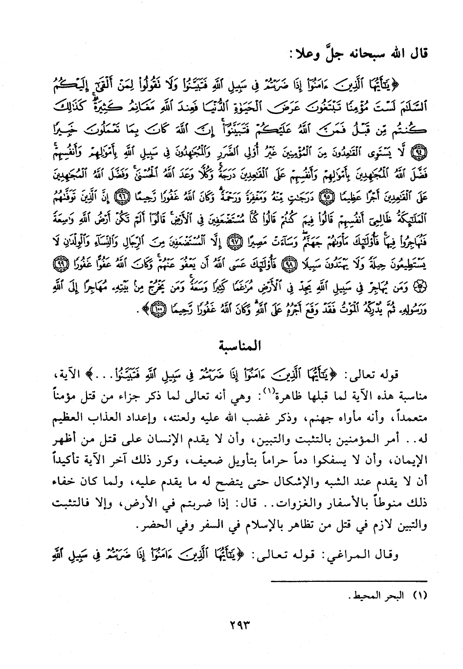 وقال المراغي: قوله تعالى: {يَا أَيُّهَا الَّذِينَ آمَنُوا إِذَا ضَرَبْتُمْ فِي سَبِيلِ اللَّهِ