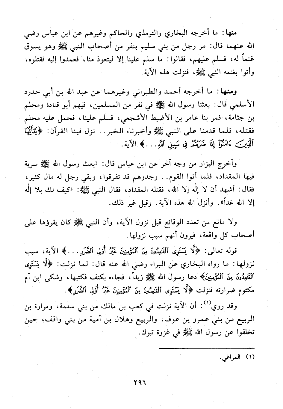 قوله تعالى: {لَا يَسْتَوِي الْقَاعِدُونَ مِنَ الْمُؤْمِنِينَ غَيْرُ أُولِي الضَّرَرِ ...} الآية، سبب نزولها: ما رواه البخاري عن البراء رضي الله عنه قال: لما نزلت: {لَا يَسْتَوِي الْقَاعِدُونَ مِنَ الْمُؤْمِنِينَ} دعا رسول الله - صلى الله عليه وسلم - زيدًا، فجاءه بكتف فكتبها، وشكى ابن أم مكتوم ضرارته فنزلت {لَا يَسْتَوِي الْقَاعِدُونَ مِنَ الْمُؤْمِنِينَ غَيْرُ أُولِي الضَّرَرِ}.