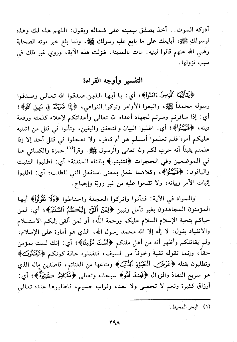 94 - {يَا أَيُّهَا الَّذِينَ آمنوا}؛ أي: يا أيها الذين صدقوا الله تعالى وصدقوا رسوله محمدًا - صلى الله عليه وسلم -، واتبعوا الأوامر وتركوا النواهي، {إِذَا ضَرَبْتُمْ فِي سَبِيلِ اللَّهِ}؛ أي: إذا سافرتم وسرتم لجهاد أعداء الله تعالى وأعدائكم لإعلاء كلمته ورفعة دينه، {فَتَبَيَّنُوا}؛ أي: اطلبوا البيان والتحقق واليقين، وتأنوا في قتل من اشتبه عليكم أمره فلم تعلموا أمسلم هو أم كافر، ولا تعجلوا في قتل أحد إلا إذا علمتم يقينًا أنه حرب لكم ولله تعالى والرسول - صلى الله عليه وسلم - وقرأ (¬1) حمزة والكسائي هنا في الموضعين وفي الحجرات {فتثبتوا} بالثاء المثلثة؛ أي: اطلبوا التثبت والباقون: {فَتَبَيَّنُوا}، وكلاهما تفعَّل بمعنى استفعل التي للطلب؛ أي: اطلبوا إثبات الأمر وبيانه، ولا تقدموا عليه من غير رويّة وإيضاح.
