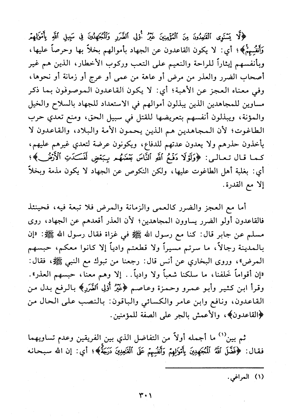 95 - {لَا يَسْتَوِي الْقَاعِدُونَ مِنَ الْمُؤْمِنِينَ غَيْرُ أُولِي الضَّرَرِ وَالْمُجَاهِدُونَ فِي سَبِيلِ اللَّهِ بِأَمْوَالِهِمْ وَأَنْفُسِهِمْ}؛ أي: لا يكون القاعدون عن الجهاد بأموالهم بخلًا بها وحرصًا عليها، وبأنفسهم إيثارًا للراحة والنعيم على التعب وركوب الأخطار، الذين هم غير أصحاب الضرر والعذر من مرض أو عاهة من عمى أو عرج أو زمانة أو نحوها، وفي معناه العجز عن الأهبة؛ أي: لا يكون القاعدون الموصوفون بما ذكر مساوين للمجاهدين الذين يبذلون أموالهم في الاستعداد للجهاد بالسلاح والخيل والمؤنة، ويبذلون أنفسهم بتعريضها للقتل في سبيل الحق، ومنع تعدي حرب الطاغوت؛ لأن المجاهدين هم الذين يحمون الأمة والبلاد، والقاعدون لا يأخذون حذرهم ولا يعدون عدتهم للدفاع، ويكونون عرضة لتعدي غيرهم عليهم، كما قال تعالى: {وَلَوْلَا دَفْعُ اللَّهِ النَّاسَ بَعْضَهُمْ بِبَعْضٍ لَفَسَدَتِ الْأَرْضُ}؛ أي: بغلبة أهل الطاغوت عليها، ولكن النكوص عن الجهاد لا يكون مذمة وبخلًا إلا مع القدرة.
