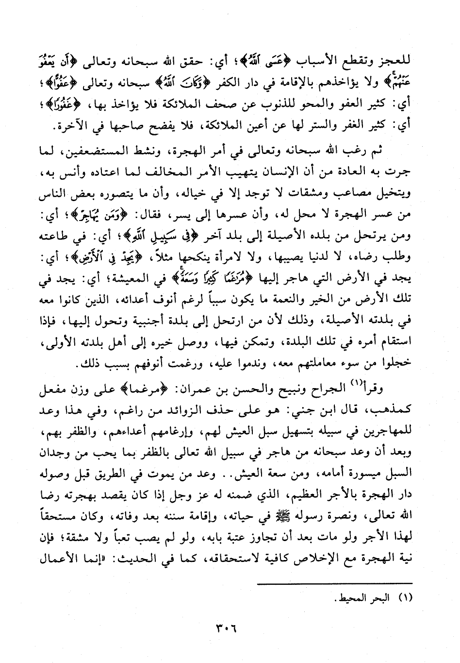 وقرأ (¬1) الجراح ونبيح والحسن بن عمران: {مرغما} على وزن مفعل كمذهب، قال ابن جني: هو على حذف الزوائد من راغم، وفي هذا وعد للمهاجرين في سبيله بتسهيل سبل العيش لهم، وإرغامهم أعداءهم، والظفر بهم، وبعد أن وعد سبحانه من هاجر في سبيل الله تعالى بالظفر بما يحب من وجدان السبل ميسورة أمامه، ومن سعة العيش .. وعد من يموت في الطريق قبل وصوله دار الهجرة بالأجر العظيم، الذي ضمنه له عز وجل إذا كان يقصد بهجرته رضا الله تعالى، ونصرة رسوله - صلى الله عليه وسلم - في حياته، وإقامة سننه بعد وفاته، وكان مستحقًا لهذا الأجر ولو مات بعد أن تجاوز عتبة بابه، ولو لم يصب تعبًا ولا مشقة؛ فإن نية الهجرة مع الإخلاص كافية لاستحقاقه، كما في الحديث: "إنما الأعمال