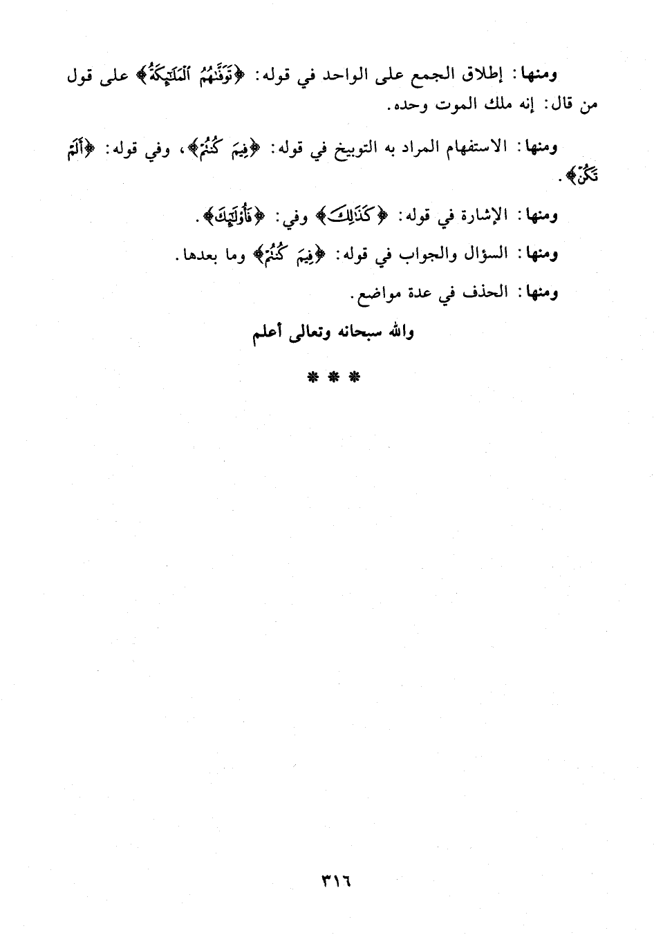 ومنها: الاستفهام المراد به التوبيخ في قوله: {فِيمَ كُنْتُمْ}، وفي قوله: {أَلَمْ تَكُنْ}.