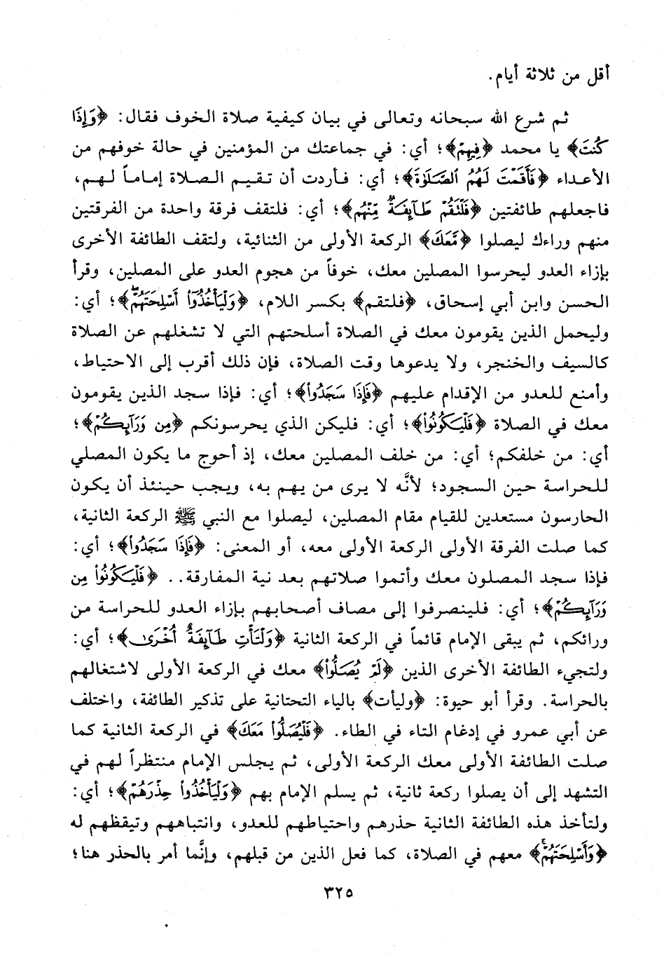 102 - ثم شرع الله سبحانه وتعالى في بيان كيفية صلاة الخوف فقال: {وَإِذَا كُنْتَ} يا محمد {فِيهِمْ}؛ أي: في جماعتك من المؤمنين في حالة خوفهم من الأعداء {فَأَقَمْتَ لَهُمُ الصَّلَاةَ}؛ أي: فأردت أن تقيم الصلاة إمامًا لهم، فاجعلهم طائفتين {فَلْتَقُمْ طَائِفَةٌ مِنْهُمْ}؛ أي: فلتقف فرقة واحدة من الفرقتين منهم وراءك ليصلوا {مَعَكَ} الركعة الأولى من الثنائية، ولتقف الطائفة الأخرى بإزاء العدو ليحرسوا المصلين معك، خوفًا من هجوم العدو على المصلين، وقرأ الحسن وابن أبي إسحاق، {فلتقم} بكسر اللام، {وَلْيَأخُذُوا أَسْلِحَتَهُمْ}؛ أي: وليحمل الذين يقومون معك في الصلاة أسلحتهم التي لا تشغلهم عن الصلاة كالسيف والخنجر، ولا يدعوها وقت الصلاة، فإن ذلك أقرب إلى الاحتياط، وأمنع للعدو من الإقدام عليهم {فَإِذَا سَجَدُوا}؛ أي: فإذا سجد الذين يقومون معك في الصلاة {فَلْيَكُونُوا}؛ أي: فليكن الذي يحرسونكم {مِنْ وَرَائِكُمْ}؛ أي: من خلفكم؛ أي: من خلف المصلين معك، إذ أحوج ما يكون المصلي للحراسة حين السجود؛ لأنَّه لا يرى من يهم به، ويجب حينئذ أن يكون الحارسون مستعدين للقيام مقام المصلين، ليصلوا مع النبي - صلى الله عليه وسلم - الركعة الثانية، كما صلت الفرقة الأولى الركعة الأولى معه، أو المعنى: {فَإِذَا سَجَدُوا}؛ أي: فإذا سجد المصلون معك وأتموا صلاتهم بعد نية المفارقة .. {فَلْيَكُونُوا مِنْ وَرَائِكُمْ}؛ أي: فلينصرفوا إلى مصاف أصحابهم بإزاء العدو للحراسة من ورائكم، ثم يبقى الإِمام قائمًا في الركعة الثانية {وَلْتَأتِ طَائِفَةٌ أُخْرَى}؛ أي: ولتجيء الطائفة الأخرى الذين {لَمْ يُصَلُّوا} معك في الركعة الأولى لاشتغالهم بالحراسة. وقرأ أبو حيوة: {وليأت} بالياء التحتانية على تذكير الطائفة، واختلف عن أبي عمرو في إدغام التاء في الطاء. {فَلْيُصَلُّوا مَعَكَ} في الركعة الثانية كما صلت الطائفة الأولى معك الركعة الأولى، ثم يجلس الإِمام منتظرًا لهم في التشهد إلى أن يصلوا ركعة ثانية، ثم يسلم الإِمام بهم {وَلْيَأخُذُوا حِذْرَهُمْ}؛ أي: ولتأخذ هذه الطائفة الثانية حذرهم واحتياطهم للعدو، وانتباههم وتيقظهم له {وَأَسْلِحَتَهُمْ} معهم في الصلاة، كما فعل الذين من قبلهم، وإنَّما أمر بالحذر هنا؛