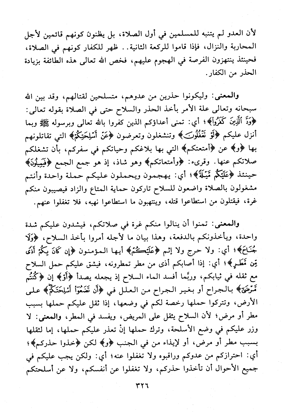 والمعنى: تمنوا أن ينالوا منكم غرة في صلاتكم، فيشدون عليكم شدة واحدة، ويأخذونكم بالدفعة، وهذا بيان ما لأجله أمروا بأخذ السلاح، {وَلَا جُنَاحَ}؛ أي: ولا حرج ولا إثم {عَلَيْكُمْ} أيها المؤمنون {إِنْ كَانَ بِكُمْ أَذًى مِنْ مَطَرٍ}؛ أي: إذا أصابكم أذى من مطر تمطرونه، فيشق عليكم حمل السلاح مع ثقله في ثيابكم، وربَّما أفسد الماء السلاح إذ يجعله يصدأ {أَوْ} إن {كُنْتُمْ مَرْضَى} بالجراح أو بغير الجراح من العلل في {أَنْ تَضَعُوا أَسْلِحَتَكُمْ} على الأرض، وتتركوا حملها رخصة لكم في وضعها، إذا ثقل عليكم حملها بسبب مطر أو مرض؛ لأن السلاح يثقل على المريض، ويفسد في المطر، والمعنى: لا وزر عليكم في وضع الأسلحة، وترك حملها إنْ تعذر عليكم حملها، إما لثقلها بسبب مطر أو مرض، أو لإيذاء من في الجنب {و} لكن {خذوا حذركم}؛ أي: احترازكم من عدوكم وراقبوه ولا تغفلوا عنه؛ أي: ولكن يجب عليكم في جميع الأحوال أن تأخذوا حذركم، ولا تغفلوا عن أنفسكم، ولا عن أسلحتكم