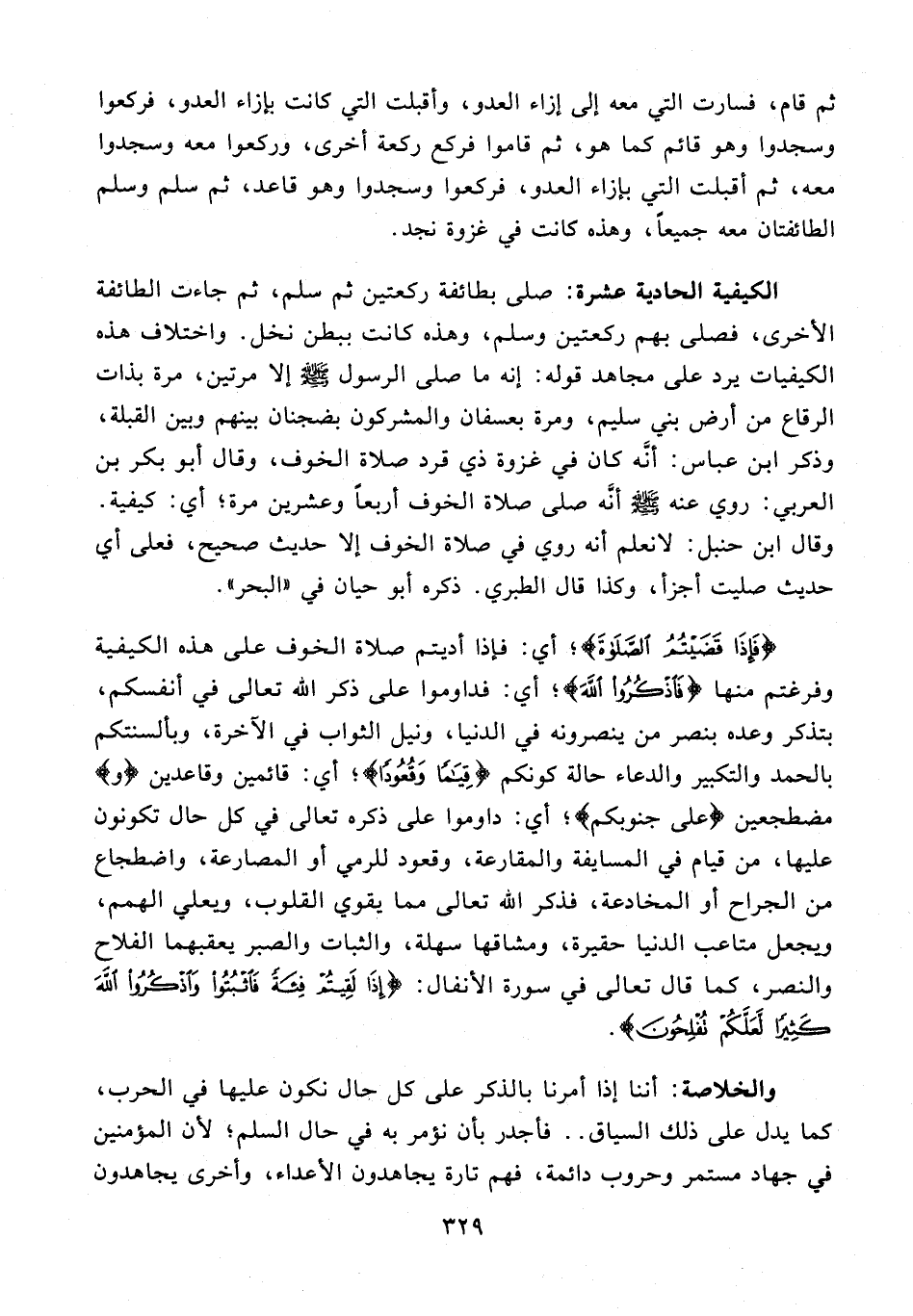 الكيفية الحادية عشرة: صلى بطائفة ركعتين ثم سلم، ثم جاءت الطائفة الأخرى، فصلى بهم ركعتين وسلم، وهذه كانت ببطن نخل. واختلاف هذه الكيفيات يرد على مجاهد قوله: إنه ما صلى الرسول - صلى الله عليه وسلم - إلا مرتين، مرة بذات الرقاع من أرض بني سليم، ومرة بعسفان والمشركون بضجنان بينهم وبين القبلة، وذكر ابن عباس: أنَّه كان في غزوة ذي قرد صلاة الخوف، وقال أبو بكر بن العربي: روي عنه - صلى الله عليه وسلم - أنَّه صلى صلاة الخوف أربعًا وعشرين مرة؛ أي: كيفية. وقال ابن حنبل: لا نعلم أنه روي في صلاة الخوف إلا حديث صحيح، فعلى أي حديث صليت أجزأ، وكذا قال الطبري. ذكره أبو حيان في "البحر".