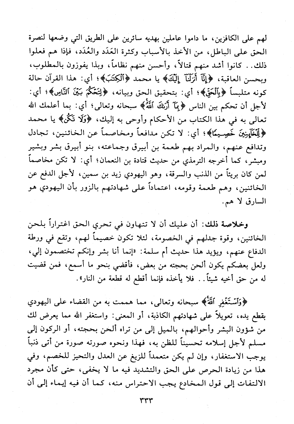105 - {إِنَّا أَنْزَلْنَا إِلَيْكَ} يا محمد {الْكِتَابَ}؛ أي: هذا القرآن حالة كونه متلبسًا {بِالْحَقِّ}؛ أي: بتحقيق الحق وبيانه، {لِتَحْكُمَ بَيْنَ النَّاسِ}؛ أي: لأجل أن تحكم بين الناس {بِمَا أَرَاكَ اللَّهُ} سبحانه وتعالى؛ أي: بما أعلمك الله تعالى به في هذا الكتاب من الأحكام وأوحى به إليك، {وَلَا تَكُن} يا محمد {لِلْخَائِنِينَ خَصِيمًا}؛ أي: لا تكن مدافعًا ومخاصمًا عن الخائنين، تجادل وتدافع عنهم، والمراد بهم طعمة بن أبيرق وجماعته، بنو أبيرق بشر وبشير ومبشر، كما أخرجه الترمذي من حديث قتادة بن النعمان؛ أي: لا تكن مخاصمًا لمن كان بريئًا من الذنب والسرقة، وهو اليهودي زيد بن سمين، لأجل الدفع عن الخائنين، وهم طعمة وقومه، اعتمادًا على شهادتهم بالزور بأن اليهودي هو السارق لا هم.