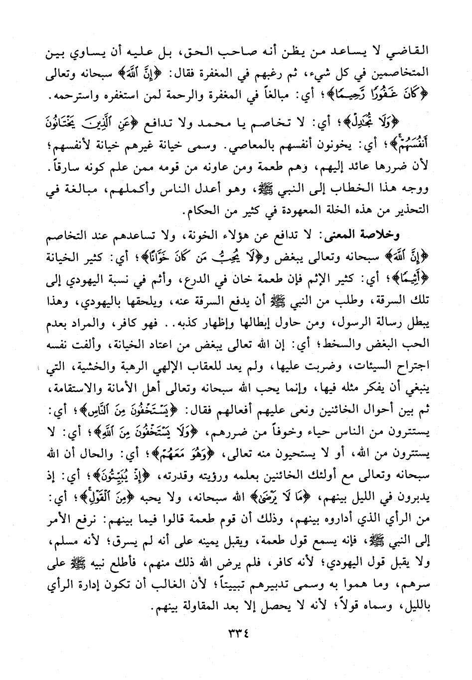 وخلاصة المعنى: لا تدافع عن هؤلاء الخونة، ولا تساعدهم عند التخاصم {إِنَّ اللَّهَ} سبحانه وتعالى يبغض و {لَا يُحِبُّ مَنْ كَانَ خَوَّانًا أَثِيمًا}؛ أي: كثير الخيانة {أَثِيمًا}؛ أي: كثير الإثم فإن طعمة خان في الدرع، وأثم في نسبة اليهودي إلى تلك السرقة، وطلب من النبي - صلى الله عليه وسلم - أن يدفع السرقة عنه، ويلحقها باليهودي، وهذا يبطل رسالة الرسول، ومن حاول إبطالها وإظهار كذبه .. فهو كافر، والمراد بعدم الحب البغض والسخط؛ أي: إن الله تعالى يبغض من اعتاد الخيانة، وألفت نفسه اجتراح السيئات، وضربت عليها، ولم يعد للعقاب الإلهي الرهبة والخشية، التي ينبغي أن يفكر مثله فيها، وإنما يحب الله سبحانه وتعالى أهل الأمانة والاستقامة،