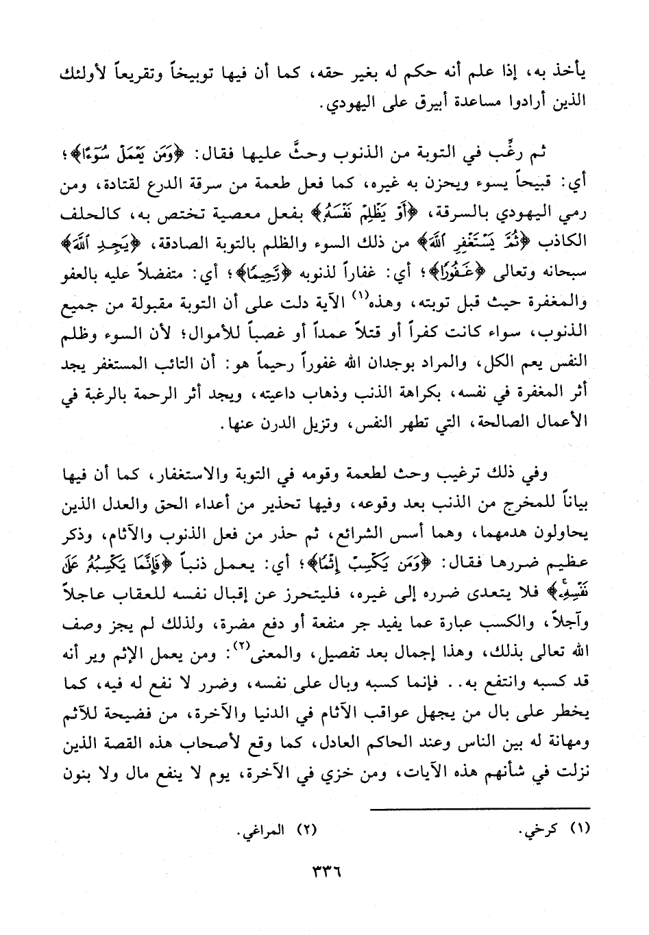 110 - ثم رغِّب في التوبة من الذنوب وحثَّ عليها فقال: {وَمَنْ يَعْمَلْ سُوءًا}؛ أي: قبيحًا يسوء ويحزن به غيره، كما فعل طعمة من سرقة الدرع لقتادة، ومن رمي اليهودي بالسرقة، {أَوْ يَظْلِمْ نَفْسَهُ} بفعل معصية تختص به، كالحلف الكاذب {ثُمَّ يَسْتَغْفِرِ اللَّهَ} من ذلك السوء والظلم بالتوبة الصادقة، {يَجِدِ اللَّهَ} سبحانه وتعالى {غَفُورًا}؛ أي: غفارًا لذنوبه {رَحِيمًا}؛ أي: متفضلًا عليه بالعفو والمغفرة حيث قبل توبته، وهذه (¬1) الآية دلت على أن التوبة مقبولة من جميع الذنوب، سواء كانت كفرًا أو قتلًا عمدًا أو غصبًا للأموال؛ لأن السوء وظلم النفس يعم الكل، والمراد بوجدان الله غفورًا رحيمًا هو: أن التائب المستغفر يجد أثر المغفرة في نفسه، بكراهة الذنب وذهاب داعيته، ويجد أثر الرحمة بالرغبة في الأعمال الصالحة، التي تطهر النفس، وتزيل الدرن عنها.