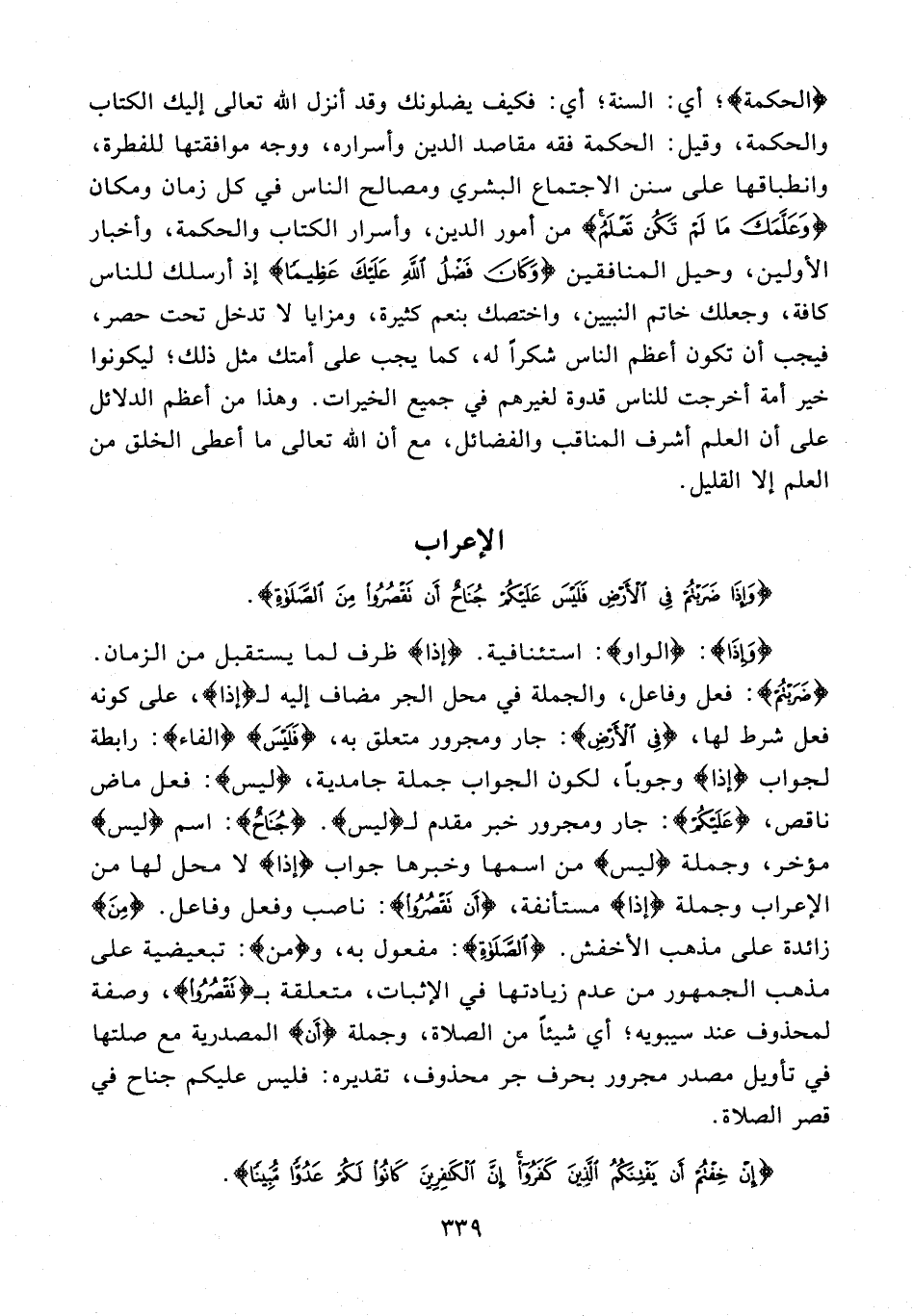 {وَإِذَا}: {الواو}: استئنافية. {إذا} ظرف لما يستقبل من الزمان. {ضَرَبْتُمْ}: فعل وفاعل، والجملة في محل الجر مضاف إليه لـ {إذا}، على كونه فعل شرط لها، {فِي الْأَرْضِ}: جار ومجرور متعلق به، {فَلَيْسَ} {الفاء}: رابطة لجواب {إذا} وجوبًا، لكون الجواب جملة جامدية، {ليس}: فعل ماض ناقص، {عَلَيْكُمْ}: جار ومجرور خبر مقدم لـ {ليس}. {جُنَاحٌ}: اسم {ليس} مؤخر، وجملة {ليس} من اسمها وخبرها جواب {إذا} لا محل لها من الإعراب وجملة {إذا} مستأنفة، {أَنْ تَقْصُرُوا}: ناصب وفعل وفاعل. {مِنَ} زائدة على مذهب الأخفش. {الصَّلَاةِ}: مفعول به، و {من}: تبعيضية على مذهب الجمهور من عدم زيادتها في الإثبات، متعلقة بـ {تَقْصُرُوا}، وصفة لمحذوف عند سيبويه؛ أي شيئًا من الصلاة، وجملة {أَن} المصدرية مع صلتها في تأويل مصدر مجرور بحرف جر محذوف، تقديره: فليس عليكم جناح في قصر الصلاة.