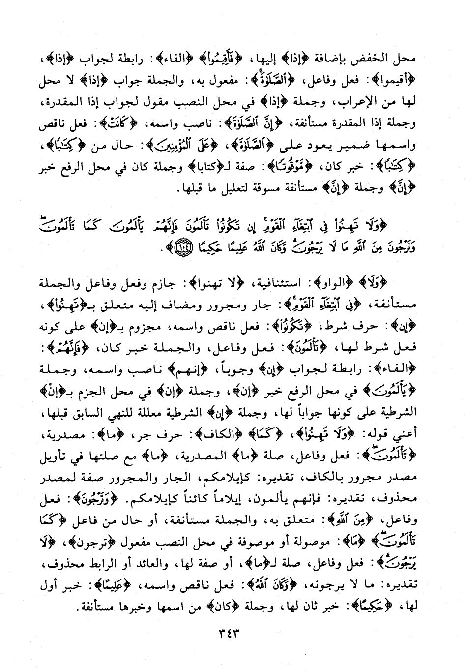 {وَلَا} {الواو}: استئنافية، {وَلَا تَهِنُوا}: جازم وفعل وفاعل والجملة مستأنفة، {فِي ابْتِغَاءِ الْقَوْمِ}: جار ومجرور ومضاف إليه متعلق بـ {تَهِنُوا}، {إن}: حرف شرط، {تَكُونُوا}: فعل ناقص واسمه: مجزوم بـ {إن} على كونه فعل شرط لها، {تَألَمُونَ}: فعل وفاعل، والجملة خبر كان، {فَإِنَّهُمْ}: {الفاء}: رابطة لجواب {إن} وجوبًا، {إنهم} ناصب واسمه، وجملة {يَألَمُونَ} في محل الرفع خبر {إن}، وجملة {إن} في محل الجزم بـ {إن} الشرطية على كونها جوابًا لها، وجملة {إن} الشرطية معللة للنهي السابق قبلها، أعني قوله: {وَلَا تَهِنُوا}، {كَمَا} {الكاف}: حرف جر، {ما}: مصدرية، {تَألَمُونَ}: فعل وفاعل، صلة {ما} المصدرية، {ما} مع صلتها في تأويل مصدر مجرور بالكاف، تقديره: كإيلامكم، الجار والمجرور صفة لمصدر محذوف، تقديره: فإنهم يألمون، إيلامًا كائنًا كإيلامكم. {وَتَرْجُونَ}: فعل وفاعل {مِنَ اللَّهِ}: متعلق به، والجملة مستأنفة، أو حال من فاعل {كَمَا تَألَمُونَ} {مَا}: موصولة أو موصوفة في محل النصب مفعول {ترجون}، {لَا يَرْجُونَ}: فعل وفاعل، صلة لـ {ما}، أو صفة لها، والعائد أو الرابط محذوف، تقديره: ما لا يرجونه، {وَكَانَ اللَّهُ}: فعل ناقص واسمه، {عَلِيمًا}: خبر أول لها، {حَكِيمًا}: خبر ثان لها، وجملة {كان} من اسمها وخبرها مستأنفة.