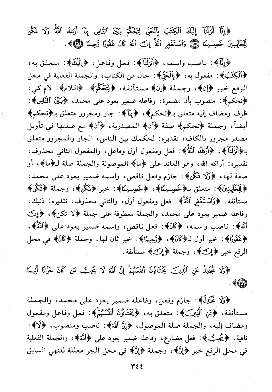 {إِنَّا}: ناصب واسمه، {أَنْزَلْنَا}: فعل وفاعل، {إِلَيْكَ}: متعلق به، {الْكِتَابَ}: مفعول به، {بِالْحَقِّ}: حال من الكتاب، والجملة الفعلية في محل الرفع خبر {إن}، وجملة {إن} مستأنفة، {لِتَحْكُمَ}: {اللام}: لام كي، {تحكم}: منصوب بأن مضمرة، وفاعله ضمير يعود على محمد، {بَيْنَ النَّاسِ}: ظرف ومضاف إليه متعلق بـ {تحكم}، {بِمَا}: جار ومجرور متعلق بـ {تحكم} أيضًا، وجملة {تحكم} صفة {أن} المصدرية، {أن} مع صلتها في تأويل مصدر مجرور بالكاف، تقديره: لحكمك بين الناس، الجار والمجرور متعلق بـ {أَنْزَلْنَا}، {أَرَاكَ اللَّهُ}: فعل ومفعول أول وفاعل، والمفعول الثاني محذوف، تقديره: أراكه الله، وهو العائد على {ما} الموصولة والجملة صلة لـ {ما}، أو صفة لها، {وَلَا تَكُن}: جازم وفعل ناقص، واسمه ضمير يعود على محمد، {لِلْخَائِنِينَ}: متعلق بـ {خَصِيمًا}، {خَصِيمًا}: خبر {تَكُنْ}، وجملة {تَكُنْ} مستأنفة. {وَاسْتَغْفِرِ اللَّهَ}: فعل ومفعول أول، والثاني محذوف، تقديره: ذنبك، وفاعله ضمير يعود على محمد، والجملة معطوفة على جملة {لا تكن}، {إِنَّ اللَّهَ}: ناصب واسمه، {كَانَ}: فعل ناقص، واسمه ضمير يعود على {اللَّهَ}، {غَفُورًا}: خبر أول لـ {كَانَ}، {رَحِيمًا}: خبر ثان لها، وجملة {كَانَ} في محل الرفع خبر {إِنَّ}، وجملة {إِنَّ} مستأنفة.