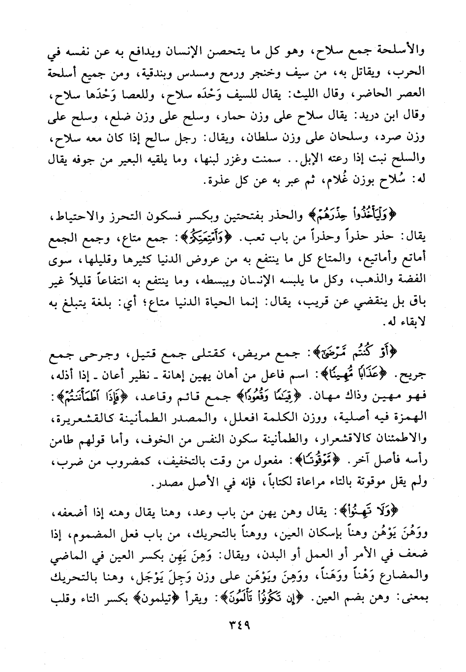 {أَوْ كُنْتُمْ مَرْضَى}: جمع مريض، كقتلى جمع قتيل، وجرحى جمع جريح. {عَذَابًا مُهِينًا}: اسم فاعل من أهان يهين إهانة - نظير أعان - إذا أذله، فهو مهين وذاك مهان. {قِيَامًا وَقُعُودًا} جمع قائم وقاعد، {فَإِذَا اطْمَأنَنْتُمْ}: الهمزة فيه أصلية، ووزن الكلمة افعلل، والمصدر الطمأنينة كالقشعريرة، والاطمئنان كالاقشعرار، والطمأنينة سكون النفس من الخوف، وأما قولهم طامن رأسه فأصل آخر. {مَوْقُوتًا}: مفعول من وقت بالتخفيف، كمضروب من ضرب، ولم يقل موقوتة بالتاء مراعاة لكتابًا، فإنه في الأصل مصدر.