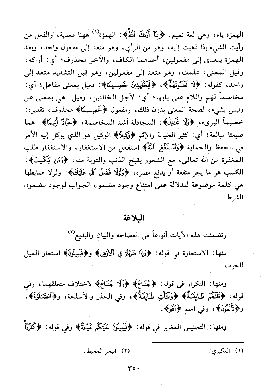 الهمزة ياء، وهي لغة تميم. {بِمَا أَرَاكَ اللَّهُ}: الهمزة (¬1) ههنا معدية، والفعل من رأيت الشيء إذا ذهبت إليه، وهو من الرأي، وهو متعد إلى مفعول واحد، وبعد الهمزة يتعدى إلى مفعولين، أحدهما الكاف، والآخر محذوف؛ أي: أراكه، وقيل المعنى: علمك، وهو متعد إلى مفعولين، وهو قبل التشديد متعد إلى واحد، كقوله: {لَا تَعْلَمُونَهُمُ}، {لِلْخَائِنِينَ خَصِيمًا}: فعيل بمعنى مفاعل؛ أي: مخاصمًا لهم واللام على بابها؛ أي: لأجل الخائنين، وقيل: هي بمعنى عن وليس بشيء، لصحة المعنى بدون ذلك، ومفعول {خَصِيمًا} محذوف، تقديره: خصيمًا البرىء، {وَلَا تُجَادِلْ}: المجادلة أشد المخاصمة، {خَوَّانًا أَثِيمًا}: هما صيغتا مبالغة؛ أي: كثير الخيانة والإثم {وَكِيلًا} الوكيل هو الذي يوكل إليه الأمر في الحفظ والحماية {وَاسْتَغْفِرِ اللَّهَ} استفعل من الاستغفار، والاستغفار طلب المغفرة من الله تعالى، مع الشعور بقبح الذنب والتوبة منه، {وَمَنْ يَكْسِبْ}: الكسب هو ما يجر منفعة أو يدفع مضرة، {وَلَوْلَا فَضْلُ اللَّهِ عَلَيْكَ}: ولولا ضابطها هي كلمة موضوعة للدلالة على امتناع وجود مضمون الجواب لوجود مضمون الشرط.
