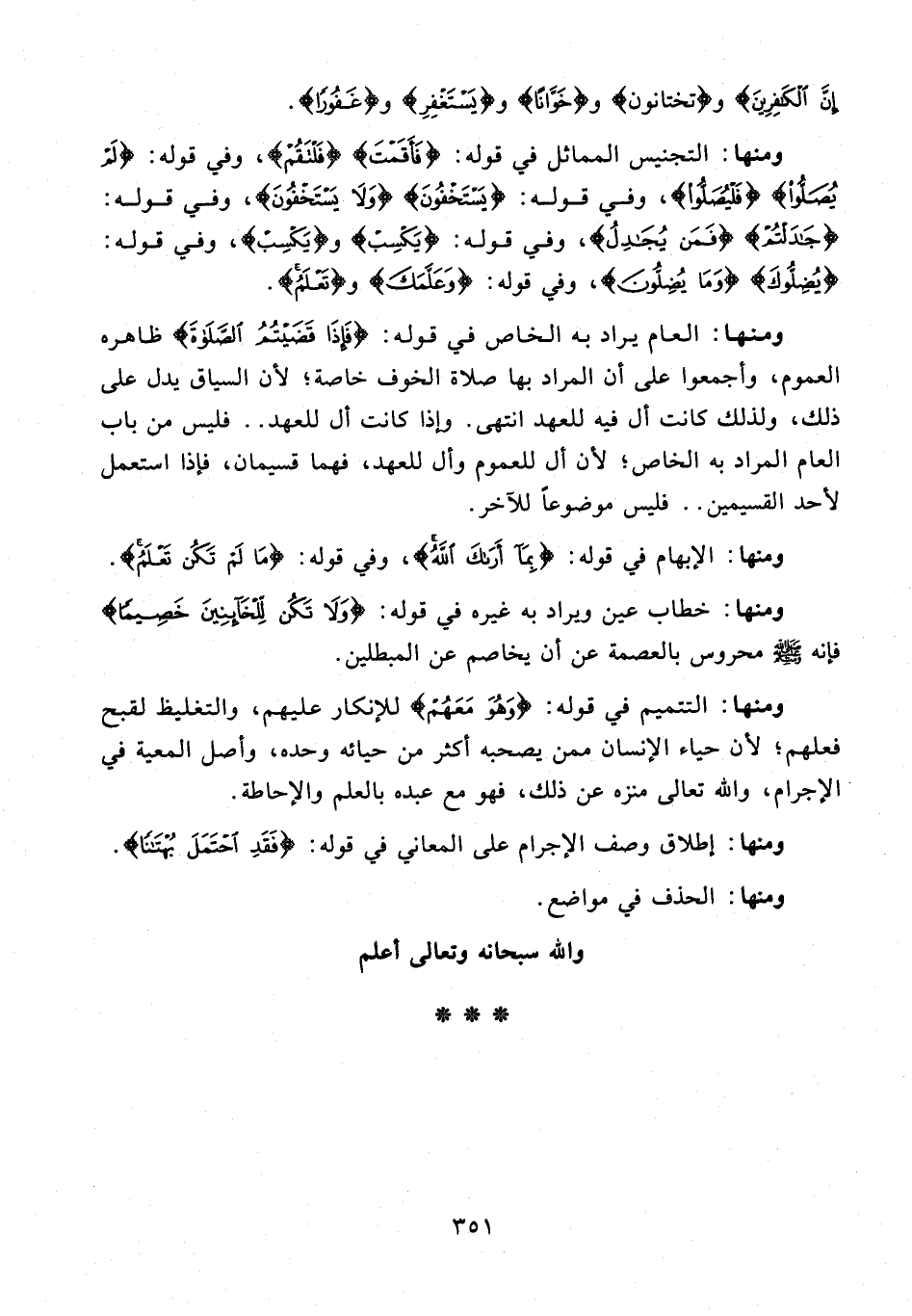 ومنها: العام يراد به الخاص في قوله {فَإِذَا قَضَيْتُمُ الصَّلَاةَ} ظاهره العموم، وأجمعوا على أن المراد بها صلاة الخوف خاصة؛ لأن السياق يدل على ذلك، ولذلك كانت أل فيه للعهد انتهى. وإذا كانت أن للعهد .. فليس من باب العام المراد به الخاص؛ لأن أن للعموم وأل للعهد، فهما قسيمان، فإذا استعمل لأحد القسيمين .. فليس موضوعًا للآخر.