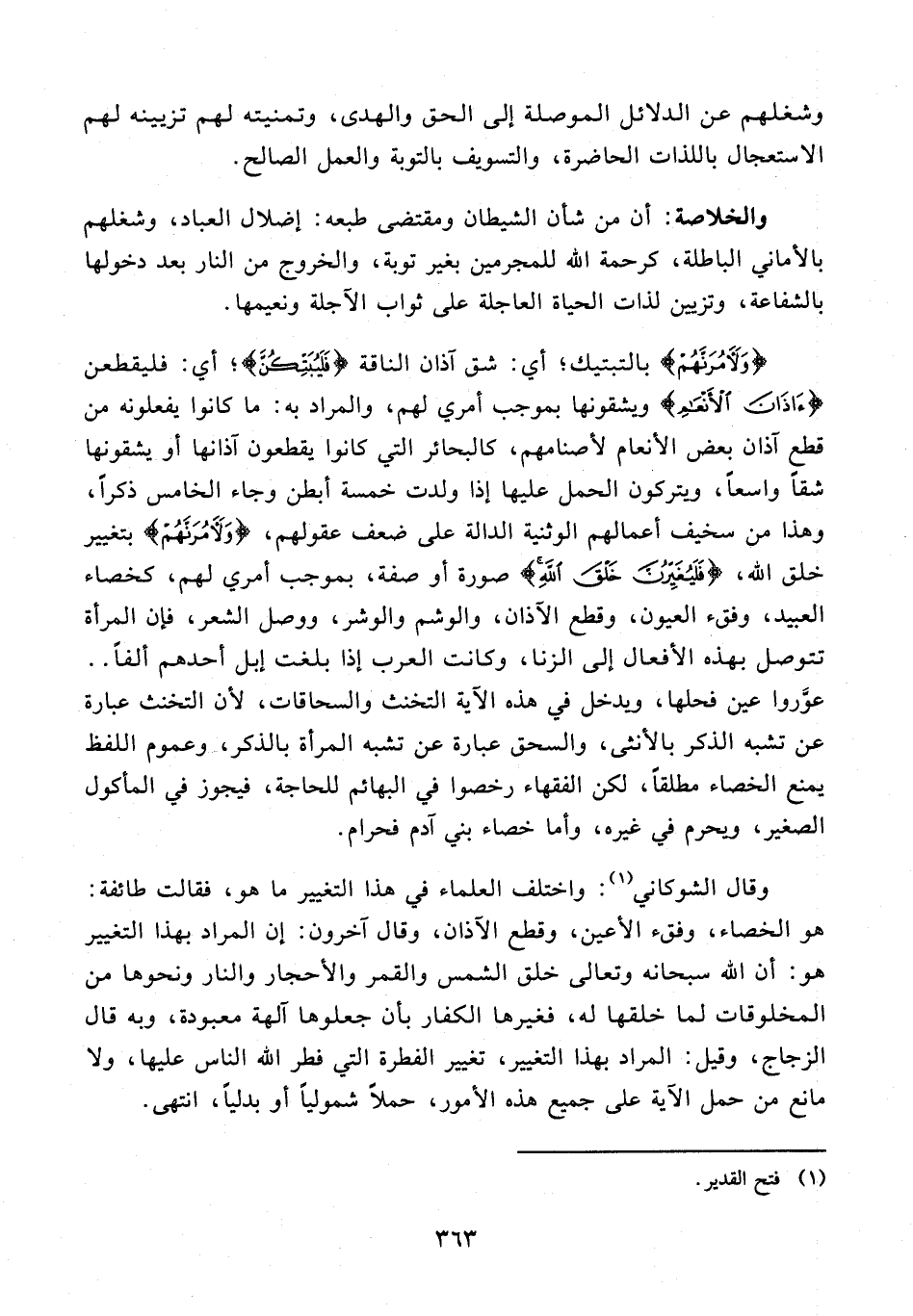 وقال الشوكاني (¬1): واختلف العلماء في هذا التغيير ما هو، فقالت طائفة: هو الخصاء، وفقء الأعين، وقطع الآذان، وقال آخرون: إن المراد بهذا التغيير هو: أن الله سبحانه وتعالى خلق الشمس والقمر والأحجار والنار ونحوها من المخلوقات لما خلقها له، فغيرها الكفار بأن جعلوها آلهة معبودة، وبه قال الزجاج، وقيل: المراد بهذا التغيير، تغيير الفطرة التي فطر الله الناس عليها، ولا مانع من حمل الآية على جميع هذه الأمور، حملًا شموليًّا أو بدليًّا، انتهى.