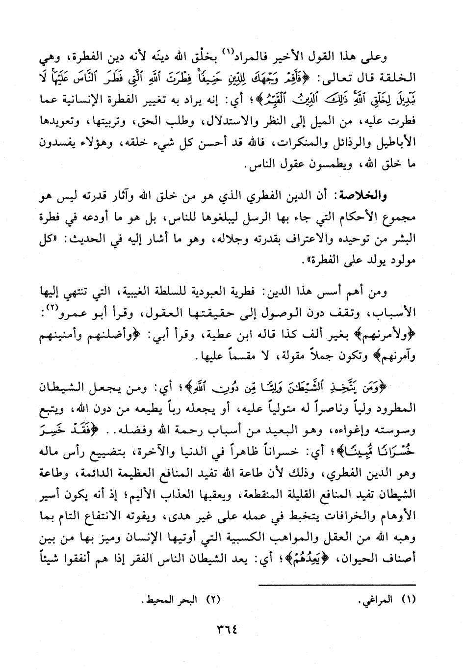 والخلاصة: أن الدين الفطري الذي هو من خلق الله وآثار قدرته ليس هو مجموع الأحكام التي جاء بها الرسل ليبلغوها للناس، بل هو ما أودعه في فطرة البشر من توحيده والاعتراف بقدرته وجلاله، وهو ما أشار إليه في الحديث: "كل مولود يولد على الفطرة".