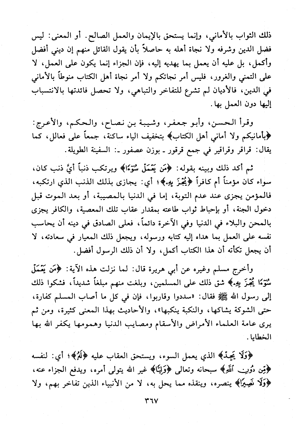 ذلك الثواب بالأماني، وإنما يستحق بالإيمان والعمل الصالح. أو المعنى: ليس فضل الدين وشرفه ولا نجاة أهله به حاصلًا بأن يقول القائل منهم إن ديني أفضل وأكمل، بل عليه أن يعمل بما يهديه إليه، فإن الجزاء إنما يكون على العمل، لا على التمني والغرور، فليس أمر نجاتكم ولا أمر نجاة أهل الكتاب منوطًا بالأماني في الدين، فالأديان لم تشرع للتفاخر والتباهي، ولا تحصل فائدتها بالانتساب إليها دون العمل بها.