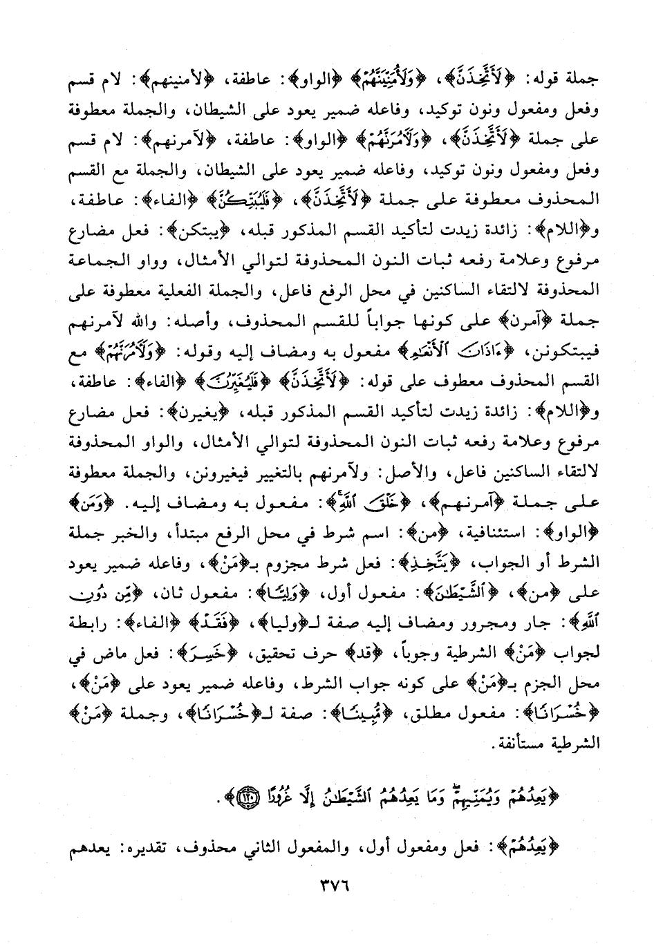 جملة قوله: {لَأَتَّخِذَنَّ}، {وَلَأُمَنِّيَنَّهُمْ} {الواو}: عاطفة، {لَأُمَنِّيَنَّهُمْ}: لام قسم وفعل ومفعول ونون توكيد، وفاعله ضمير يعود على الشيطان، والجملة معطوفة على جملة {لَأَتَّخِذَنَّ}، {وَلَآمُرَنَّهُمْ} {الواو}: عاطفة، {لَآمُرَنَّهُمْ}: لام قسم وفعل ومفعول ونون توكيد، وفاعله ضمير يعود على الشيطان، والجملة مع القسم المحذوف معطوفة على جملة {لَأَتَّخِذَنَّ}، {فَلَيُبَتِّكُنَّ} {الفاء}: عاطفة، و {اللام}: زائدة زيدت لتأكيد القسم المذكور قبله، {يبتكن}: فعل مضارع مرفوع وعلامة رفعه ثبات النون المحذوفة لتوالي الأمثال، وواو الجماعة المحذوفة لالتقاء الساكنين في محل الرفع فاعل، والجملة الفعلية معطوفة على جملة {آمرن} على كونها جوابًا للقسم المحذوف، وأصله: والله لآمرنهم فيبتكونن، {آذَانَ الْأَنْعَامِ} مفعول به ومضاف إليه وقوله: {وَلَآمُرَنَّهُمْ} مع القسم المحذوف معطوف على قوله: {لَأَتَّخِذَنَّ} {فَلَيُغَيِّرُنَّ} {الفاء}: عاطفة، و {اللام}: زائدة زيدت لتأكيد القسم المذكور قبله، {يغيرن}: فعل مضارع مرفوع وعلامة رفعه ثبات النون المحذوفة لتوالي الأمثال، والواو المحذوفة لالتقاء الساكنين فاعل، والأصل: ولآمرنهم بالتغيير فيغيرونن، والجملة معطوفة على جملة {آمرنهم}، {خَلْقَ اللَّهِ}: مفعول به ومضاف إليه. {وَمَنْ} {الواو}: استئنافية، {من}: اسم شرط في محل الرفع مبتدأ، والخبر جملة الشرط أو الجواب، {يَتَّخِذِ}: فعل شرط مجزوم بـ {مَنْ}، وفاعله ضمير يعود على {مَنْ}، {الشَّيْطَانَ}: مفعول أول، {وَلِيًّا}: مفعول ثان، {مِنْ دُونِ اللَّهِ}: جار ومجرور ومضاف إليه صفة لـ {وَلِيًّا}، {فَقَدْ} {الفاء}: رابطة لجواب {مَنْ} الشرطية وجوبًا، {قَدْ} حرف تحقيق، {خَسِرَ}: فعل ماض في محل الجزم بـ {مَنْ} على كونه جواب الشرط، وفاعله ضمير يعود على {مَنْ}، {خُسْرَانًا}: مفعول مطلق، {مُبِينًا}: صفة لـ {خُسْرَانًا}، وجملة {مَنْ} الشرطية مستأنفة.