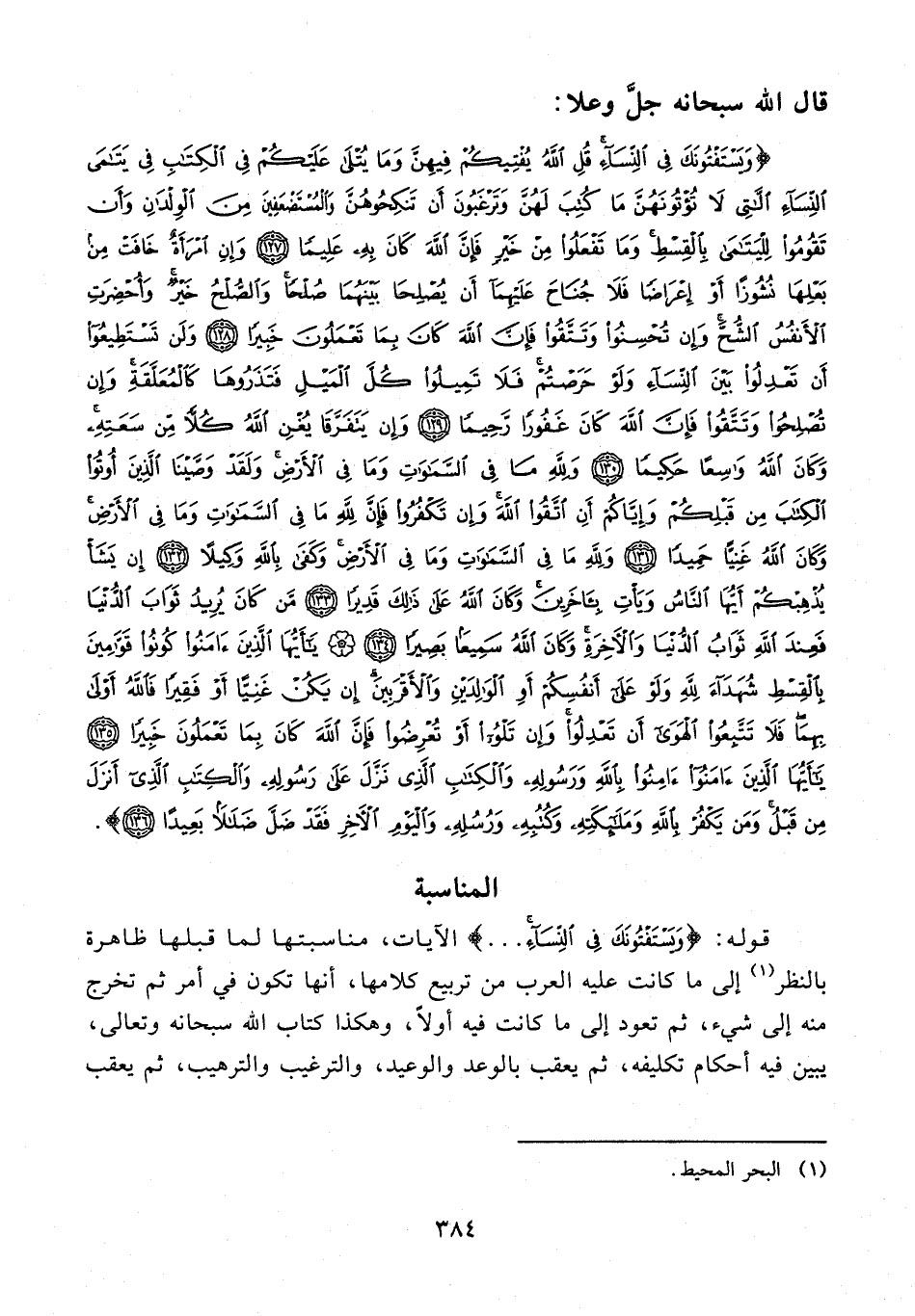 {وَيَسْتَفْتُونَكَ فِي النِّسَاءِ قُلِ اللَّهُ يُفْتِيكُمْ فِيهِنَّ وَمَا يُتْلَى عَلَيْكُمْ فِي الْكِتَابِ فِي يَتَامَى النِّسَاءِ اللَّاتِي لَا تُؤْتُونَهُنَّ مَا كُتِبَ لَهُنَّ وَتَرْغَبُونَ أَنْ تَنْكِحُوهُنَّ وَالْمُسْتَضْعَفِينَ مِنَ الْوِلْدَانِ وَأَنْ تَقُومُوا لِلْيَتَامَى بِالْقِسْطِ وَمَا تَفْعَلُوا مِنْ خَيْرٍ فَإِنَّ اللَّهَ كَانَ بِهِ عَلِيمًا (127) وَإِنِ امْرَأَةٌ خَافَتْ مِنْ بَعْلِهَا نُشُوزًا أَوْ إِعْرَاضًا فَلَا جُنَاحَ عَلَيْهِمَا أَنْ يُصْلِحَا بَيْنَهُمَا صُلْحًا وَالصُّلْحُ خَيْرٌ وَأُحْضِرَتِ الْأَنْفُسُ الشُّحَّ وَإِنْ تُحْسِنُوا وَتَتَّقُوا فَإِنَّ اللَّهَ كَانَ بِمَا تَعْمَلُونَ خَبِيرًا (128) وَلَنْ تَسْتَطِيعُوا أَنْ تَعْدِلُوا بَيْنَ النِّسَاءِ وَلَوْ حَرَصْتُمْ فَلَا تَمِيلُوا كُلَّ الْمَيْلِ فَتَذَرُوهَا كَالْمُعَلَّقَةِ وَإِنْ تُصْلِحُوا وَتَتَّقُوا فَإِنَّ اللَّهَ كَانَ غَفُورًا رَحِيمًا (129) وَإِنْ يَتَفَرَّقَا يُغْنِ اللَّهُ كُلًّا مِنْ سَعَتِهِ وَكَانَ اللَّهُ وَاسِعًا حَكِيمًا (130) وَلِلَّهِ مَا فِي السَّمَاوَاتِ وَمَا فِي الْأَرْضِ وَلَقَدْ وَصَّيْنَا الَّذِينَ أُوتُوا الْكِتَابَ مِنْ قَبْلِكُمْ وَإِيَّاكُمْ أَنِ اتَّقُوا اللَّهَ وَإِنْ تَكْفُرُوا فَإِنَّ لِلَّهِ مَا فِي السَّمَاوَاتِ وَمَا فِي الْأَرْضِ وَكَانَ اللَّهُ غَنِيًّا حَمِيدًا (131) وَلِلَّهِ مَا فِي السَّمَاوَاتِ وَمَا فِي الْأَرْضِ وَكَفَى بِاللَّهِ وَكِيلًا (132) إِنْ يَشَأْ يُذْهِبْكُمْ أَيُّهَا النَّاسُ وَيَأْتِ بِآخَرِينَ وَكَانَ اللَّهُ عَلَى ذَلِكَ قَدِيرًا (133) مَنْ كَانَ يُرِيدُ ثَوَابَ الدُّنْيَا فَعِنْدَ اللَّهِ ثَوَابُ الدُّنْيَا وَالْآخِرَةِ وَكَانَ اللَّهُ سَمِيعًا بَصِيرًا (134) يَا أَيُّهَا الَّذِينَ آمَنُوا كُونُوا قَوَّامِينَ بِالْقِسْطِ شُهَدَاءَ لِلَّهِ وَلَوْ عَلَى أَنْفُسِكُمْ أَوِ الْوَالِدَيْنِ وَالْأَقْرَبِينَ إِنْ يَكُنْ غَنِيًّا أَوْ فَقِيرًا فَاللَّهُ أَوْلَى بِهِمَا فَلَا تَتَّبِعُوا الْهَوَى أَنْ تَعْدِلُوا وَإِنْ تَلْوُوا أَوْ تُعْرِضُوا فَإِنَّ اللَّهَ كَانَ بِمَا تَعْمَلُونَ خَبِيرًا (135) يَا أَيُّهَا الَّذِينَ آمَنُوا آمِنُوا بِاللَّهِ وَرَسُولِهِ وَالْكِتَابِ الَّذِي نَزَّلَ عَلَى رَسُولِهِ وَالْكِتَابِ الَّذِي أَنْزَلَ مِنْ قَبْلُ وَمَنْ يَكْفُرْ بِاللَّهِ وَمَلَائِكَتِهِ وَكُتُبِهِ وَرُسُلِهِ وَالْيَوْمِ الْآخِرِ فَقَدْ ضَلَّ ضَلَالًا بَعِيدًا (136)}.