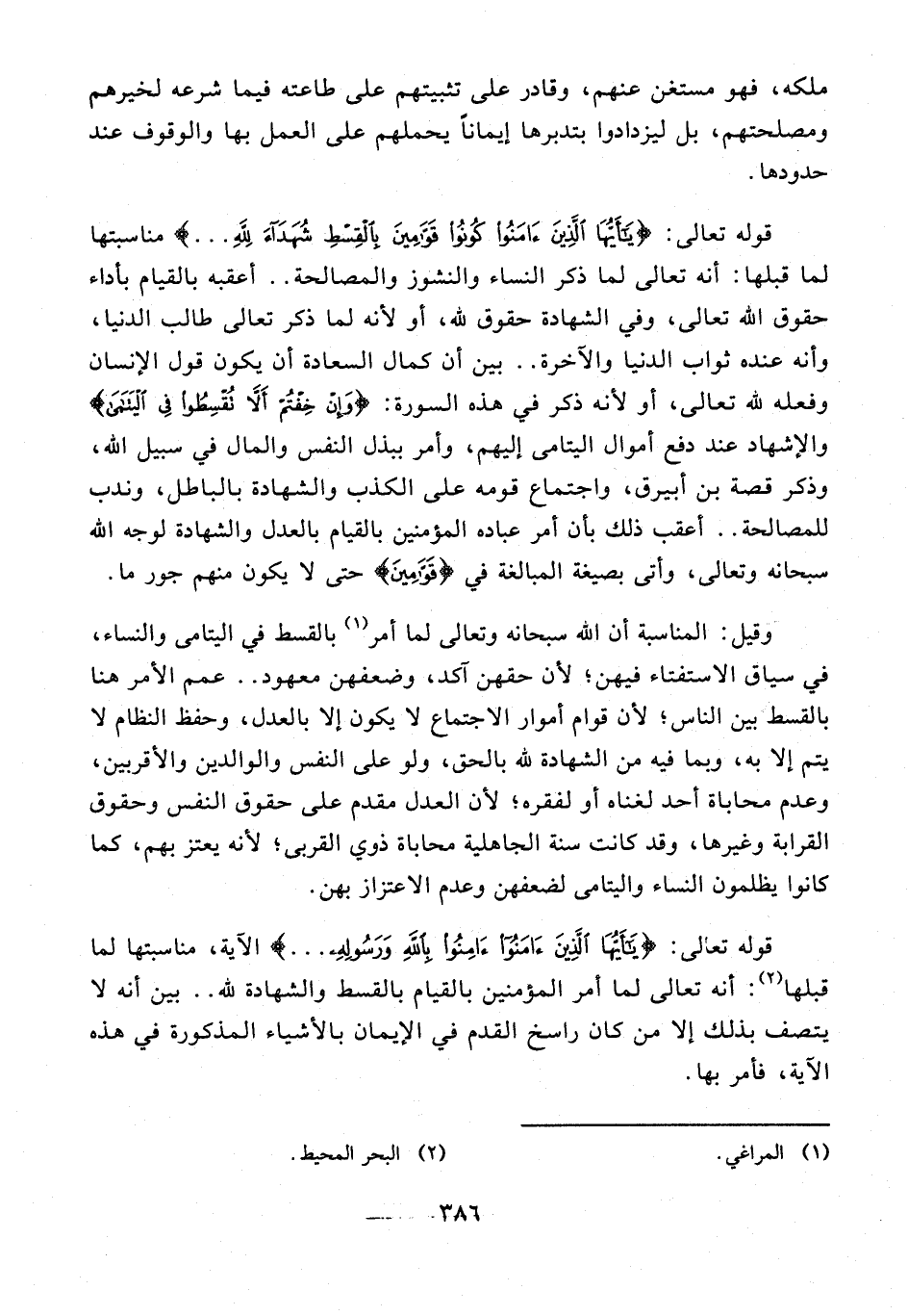 قوله تعالى: {يَا أَيُّهَا الَّذِينَ آمَنُوا كُونُوا قَوَّامِينَ بِالْقِسْطِ شُهَدَاءَ لِلَّهِ ...} مناسبتها لما قبلها: أنه تعالى لما ذكر النساء والنشوز والمصالحة .. أعقبه بالقيام بأداء حقوق الله تعالى، وفي الشهادة حقوق لله، أو لأنه لما ذكر تعالى طالب الدنيا، وأنه عنده ثواب الدنيا والآخرة .. بين أن كمال السعادة أن يكون قول الإنسان وفعله لله تعالى، أو لأنه ذكر في هذه السورة: {وَإِنْ خِفْتُمْ أَلَّا تُقْسِطُوا فِي الْيَتَامَى} والإشهاد عند دفع أموال اليتامى إليهم، وأمر ببذل النفس والمال في سبيل الله، وذكر قصة بن أبيرق، واجتماع قومه على الكذب والشهادة بالباطل، وندب للمصالحة .. أعقب ذلك بأن أمر عباده المؤمنين بالقيام بالعدل والشهادة لوجه الله سبحانه وتعالى، وأتى بصيغة المبالغة في {قَوَّامِينَ} حتى لا يكون منهم جور ما.
