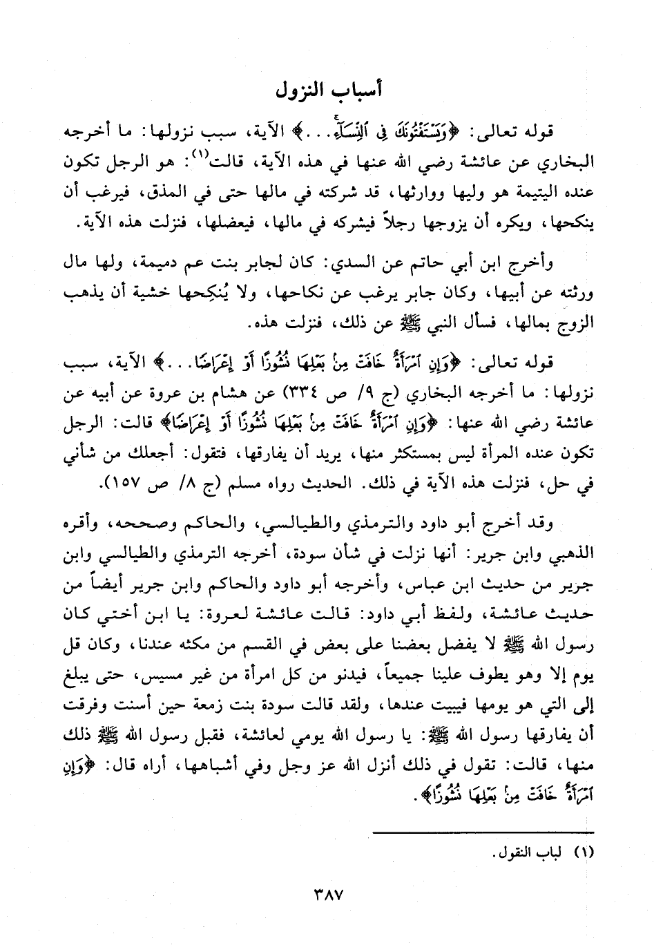 قوله تعالى: {وَإِنِ امْرَأَةٌ خَافَتْ مِنْ بَعْلِهَا نُشُوزًا أَوْ إِعْرَاضًا ...} الآية، سبب نزولها: ما أخرجه البخاري (ج 9/ ص 334) عن هشام بن عروة عن أبيه عن عائشة رضي الله عنها: {وَإِنِ امْرَأَةٌ خَافَتْ مِنْ بَعْلِهَا نُشُوزًا أَوْ إِعْرَاضًا} قالت: الرجل تكون عنده المرأة ليس بمستكثر منها، يريد أن يفارقها، فتقول: أجعلك من شأني في حل، فنزلت هذه الآية في ذلك. الحديث رواه مسلم (ج 8/ ص 157).
