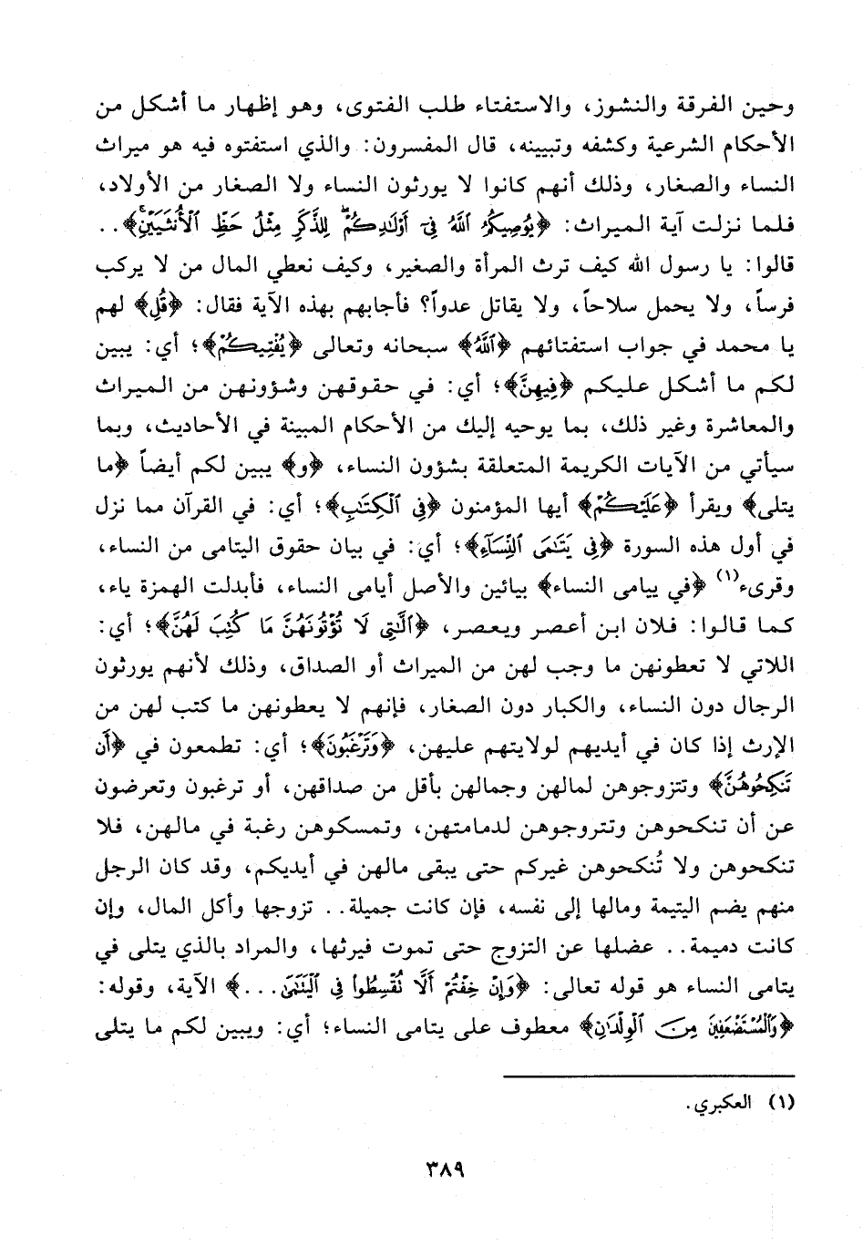 وحين الفرقة والنشوز، والاستفتاء طلب الفتوى، وهو إظهار ما أشكل من الأحكام الشرعية وكشفه وتبيينه، قال المفسرون: والذي استفتوه فيه هو ميراث النساء والصغار، وذلك أنهم كانوا لا يورثون النساء ولا الصغار من الأولاد، فلما نزلت آية الميراث: {يُوصِيكُمُ اللَّهُ فِي أَوْلَادِكُمْ لِلذَّكَرِ مِثْلُ حَظِّ الْأُنْثَيَيْنِ} .. قالوا: يا رسول الله كيف ترث المرأة والصغير، وكيف نعطي المال من لا يركب فرسًا، ولا يحمل سلاحًا، ولا يقاتل عدوًّا؟ فأجابهم بهذه الآية فقال: {قُلِ} لهم يا محمَّد في جواب استفتائهم {اللَّهُ} سبحانه وتعالى {يُفْتِيكُمْ}؛ أي: يبين لكم ما أشكل عليكم {فِيهِنَّ}؛ أي: في حقوقهن وشؤونهن من الميراث والمعاشرة وغير ذلك، بما يوحيه إليك من الأحكام المبينة في الأحاديث، وبما سيأتي من الآيات الكريمة المتعلقة بشؤون النساء، {و} يبين لكم أيضًا {ما يتلى} ويقرأ {عَلَيْكُمْ} أيها المؤمنون {فِي الْكِتَابِ}؛ أي: في القرآن مما نزل في أول هذه السورة {فِي يَتَامَى النِّسَاءِ}؛ أي: في بيان حقوق اليتامى من النساء، وقرىء (¬1) {في يتامى النساء} بيائين والأصل أيامى النساء، فأبدلت الهمزة ياء، كما قالوا: فلان ابن أعصر ويعصر، {اللَّاتِي لَا تُؤْتُونَهُنَّ مَا كُتِبَ لَهُنَّ}؛ أي: اللاتي لا تعطونهن ما وجب لهن من الميراث أو الصداق، وذلك لأنهم يورثون الرجال دون النساء، والكبار دون الصغار، فإنهم لا يعطونهن ما كتب لهن من الإرث إذا كان في أيديهم لولايتهم عليهن، {وَتَرْغَبُونَ}؛ أي: تطمعون في {أَنْ تَنْكِحُوهُنَّ} وتتزوجوهن لمالهن وجمالهن بأقل من صداقهن، أو ترغبون وتعرضون عن أن تنكحوهن وتتروجوهن لدمامتهن، وتمسكوهن رغبة في مالهن، فلا تنكحوهن ولا تُنكحوهن غيركم حتى يبقى مالهن في أيديكم، وقد كان الرجل منهم يضم اليتيمة ومالها إلى نفسه، فإن كانت جميلة .. تزوجها وأكل المال، وإن كانت دميمة .. عضلها عن التزوج حتى تموت فيرثها، والمراد بالذي يتلى في يتامى النساء هو قوله تعالى: {وَإِنْ خِفْتُمْ أَلَّا تُقْسِطُوا فِي الْيَتَامَى ..} الآية، وقوله: {وَالْمُسْتَضْعَفِينَ مِنَ الْوِلْدَانِ} معطوف على يتامى النساء؛ أي: ويبين لكم ما يتلى