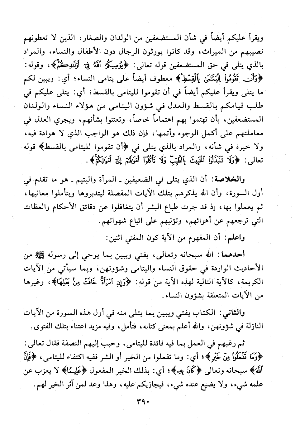 والخلاصة: أن الذي يتلى في الضعيفين - المرأة واليتيم - هو ما تقدم في أول السورة، وأن الله يذكرهم بتلك الآيات المفصلة ليتدبروها ويتأملوا معانيها، ثم يعملوا بها، إذ قد جرت طباع البشر أن يتغافلوا عن دقائق الأحكام والعظات التي ترجعهم عن أهوائهم، وتؤنبهم على اتباع شهواتهم.
