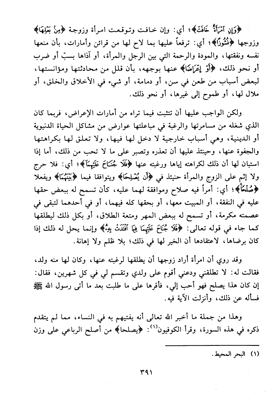 128 - {وَإِنِ امْرَأَةٌ خَافَتْ}؛ أي: وإن خافت وتوقعت امرأة وزوجة {مِنْ بَعْلِهَا} وزوجها {نُشُوزًا}؛ أي: ترفعًا عليها بما لاح لها من قرائن وأمارات، بأن منعها نفسه ونفقتها، والمودة والرحمة التي بين الرجل والمرأة، أو آذاها بسبّ أو ضرب أو نحو ذلك، {أَوْ إِعْرَاضًا} عنها بوجهه، بأن قلل من محادثتها ومؤانستها، لبعض أسباب من طعن في سن، أو دمامة، أو شيء في الأخلاق والخلق، أو ملال لها، أو طموح إلى غيرها، أو نحو ذلك.